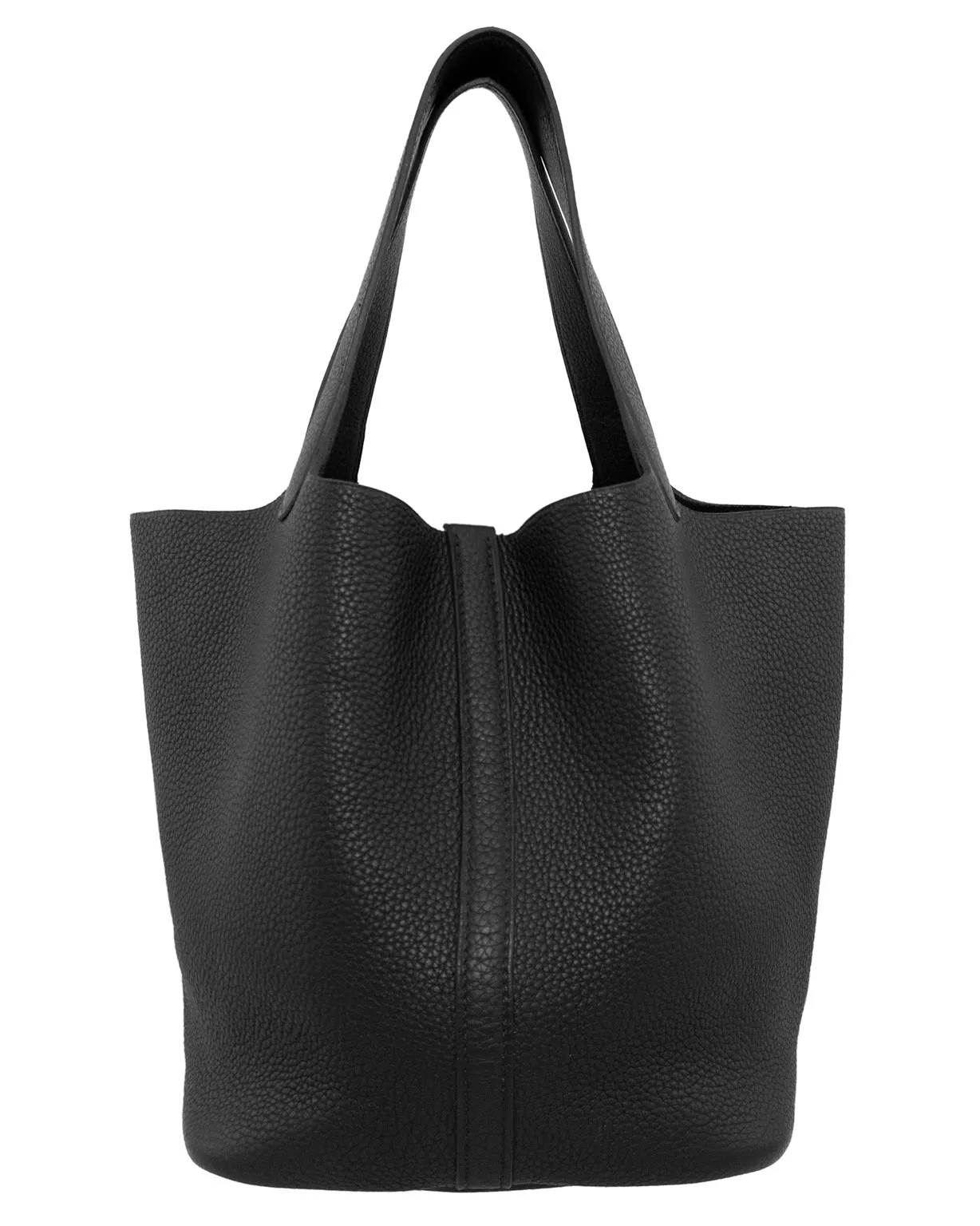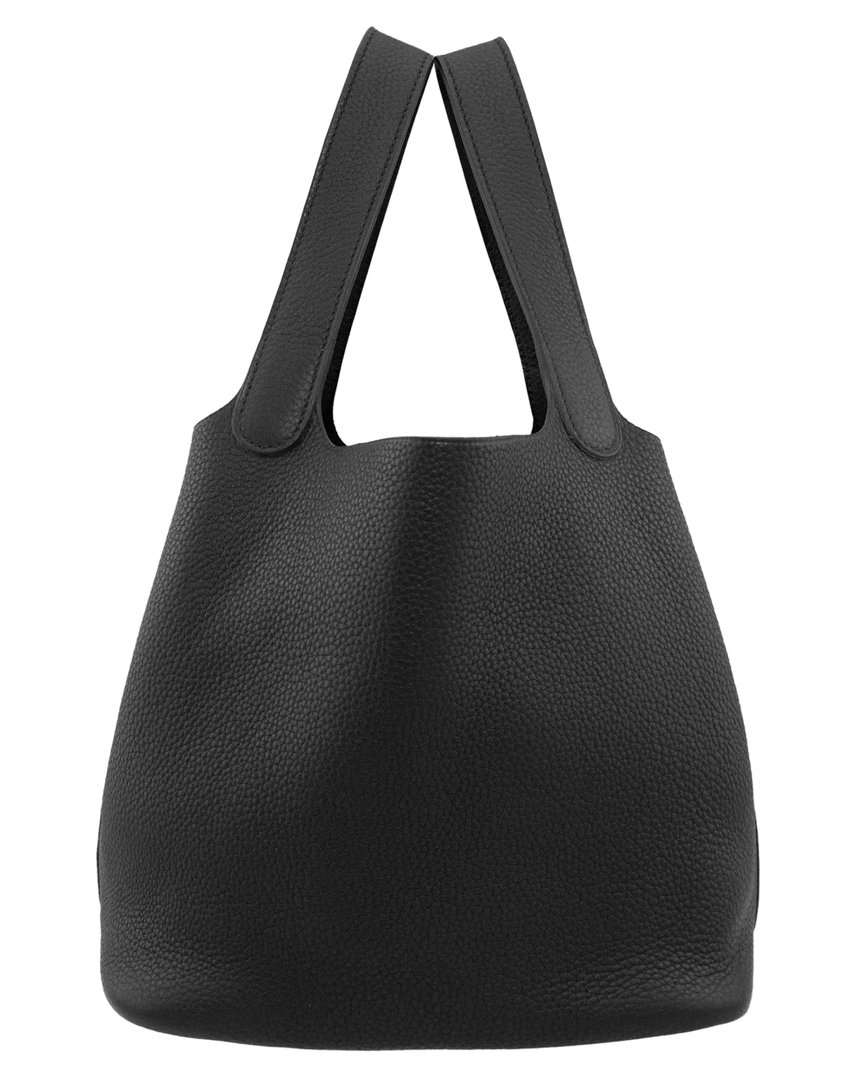 This Picotin MM (medium size) dates from 2008, as stated by the square L interior blind stamp. Black Clemence leather. Clemence leather has a semi-matte smooth, pebbled-grained surface that creates a slightly slouchy and relaxed handbag. Unlined. Handmade in France by Hermes artisans. Excellent vintage condition. Sold without box or sleeper bag. 22cm x 23cm x 18cm.