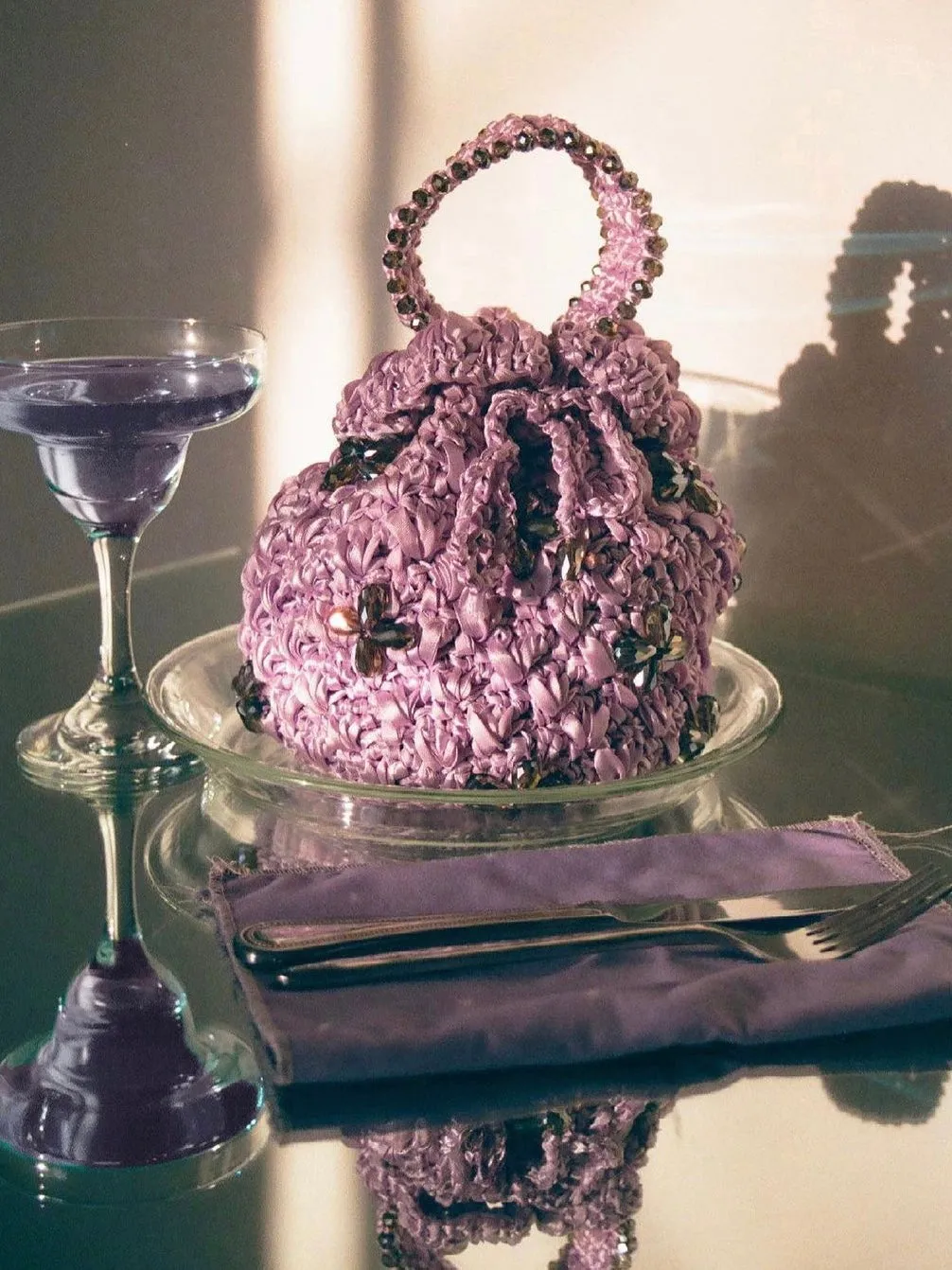 Embellished with geometric teardrop beading and a contrasting bead handle. This style has a drawstring closure to keep your belongings safe and sound.