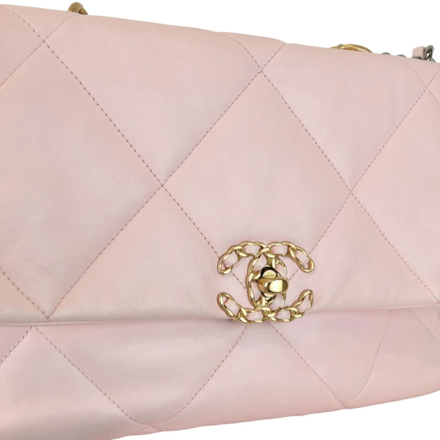 This is an authentic Chanel 19 Flap Large Lambskin Quilted in Light Pink. This shoulder bag is made from quilted lambskin leather. It includes an aged gold chain top handle and a leather-threaded shoulder strap transitioning from gold to ruthenium. The bag has a magnetic snap pocket at the back. The flap opens with a leather-threaded classic CC turn-lock, revealing a pink fabric interior with a zipper pocket.