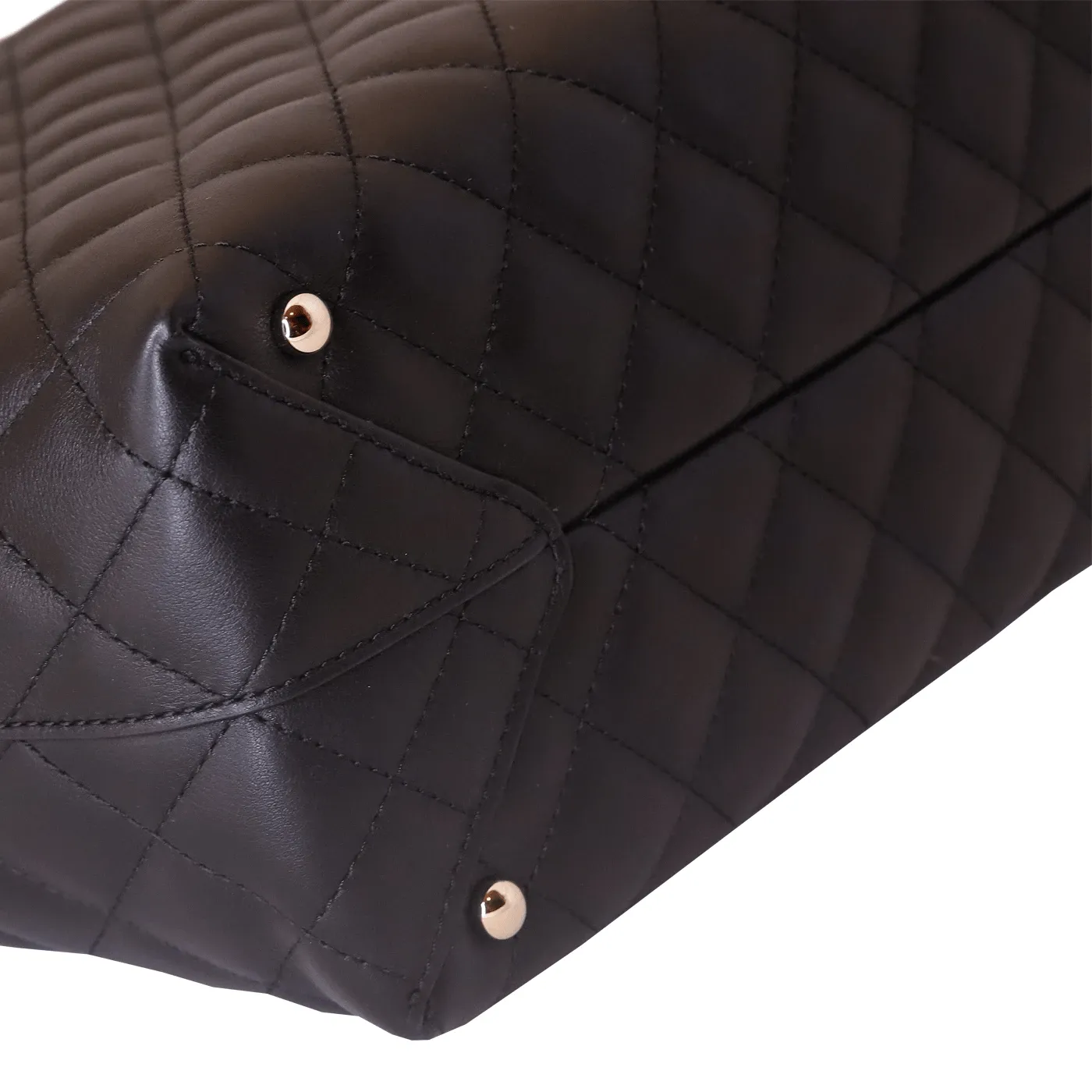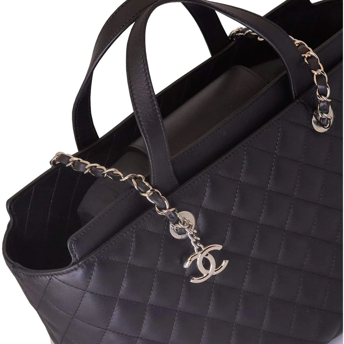 Shop this elegant Chanel Black Lambskin Shopper Tote at Luxury Promise now. This Chanel tote is crafted from smooth lambskin leather in black and finished with silver hardware. It features the iconic CC chain accessory and comes with a chain leather strap. It features a magnetic opening button and has a spacious interior compartment. This Chanel tote is in pristine condition and comes with box, dust bag and authenticity card.