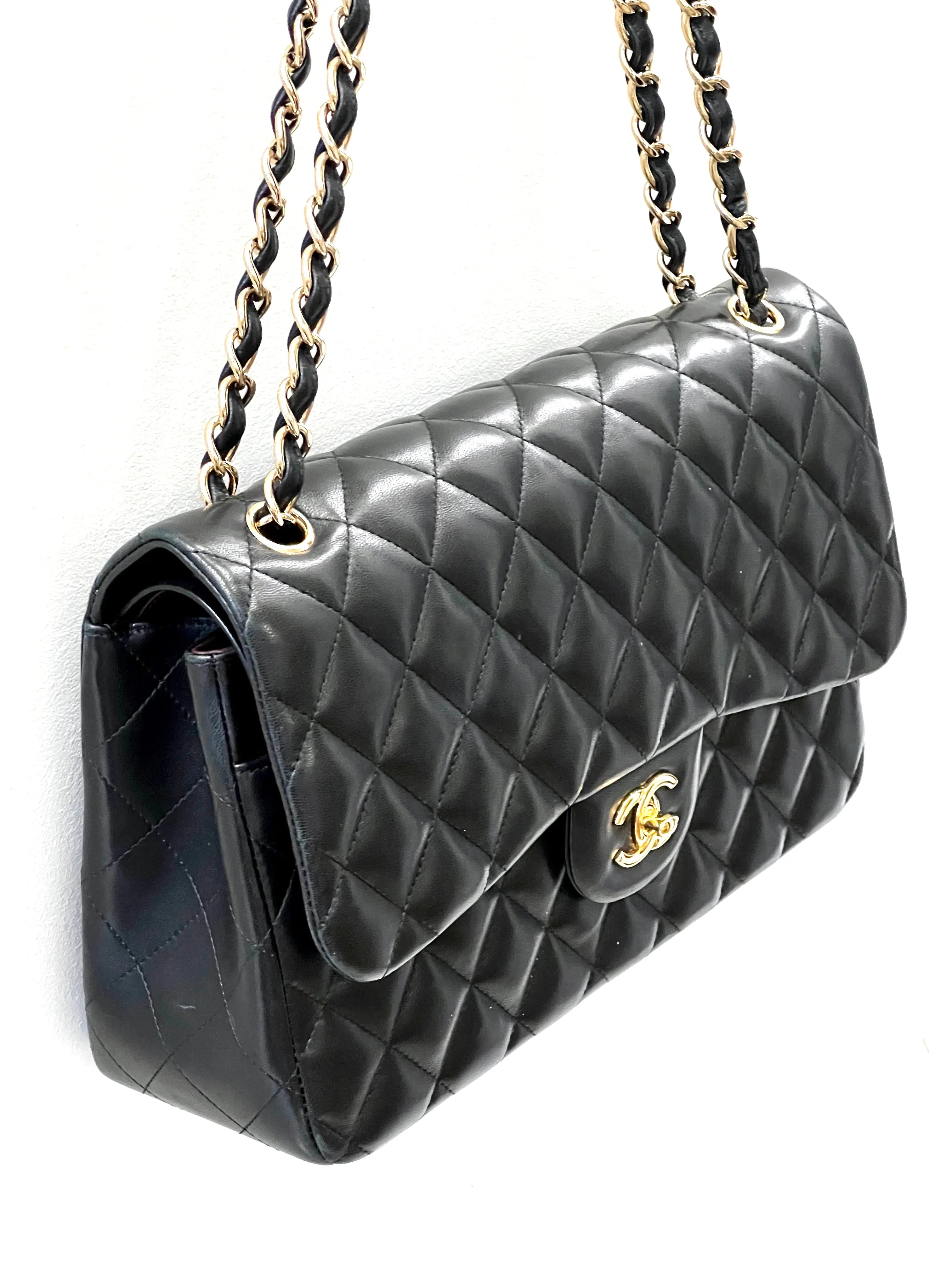 The Chanel Quilted Lambskin Double Flap Jumbo bag is a luxury handbag designed by the French fashion house, Chanel. It features a classic quilted design made of soft and supple lambskin leather, which gives the bag a timeless and elegant look.