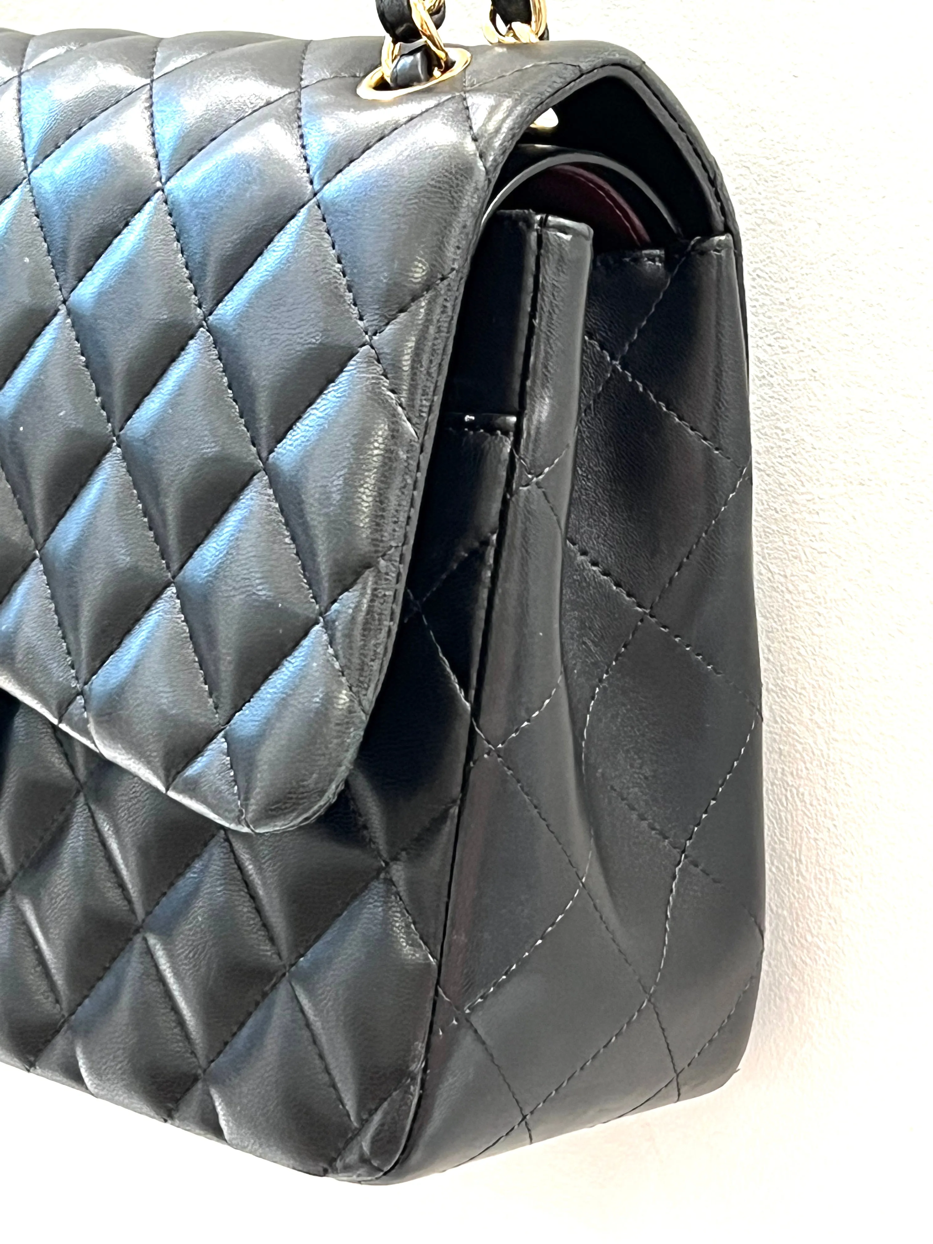 The Jumbo size of the bag makes it larger than the traditional medium and small sizes, providing ample space for your daily essentials such as a phone, wallet, keys, and makeup. The interior of the bag is lined with luxurious burgundy leather and features two main compartments, a zipper pocket, and a patch pocket. The iconic Chanel interlocking CC logo is embossed on the second flap of the bag, making it a recognizable symbol of high fashion.