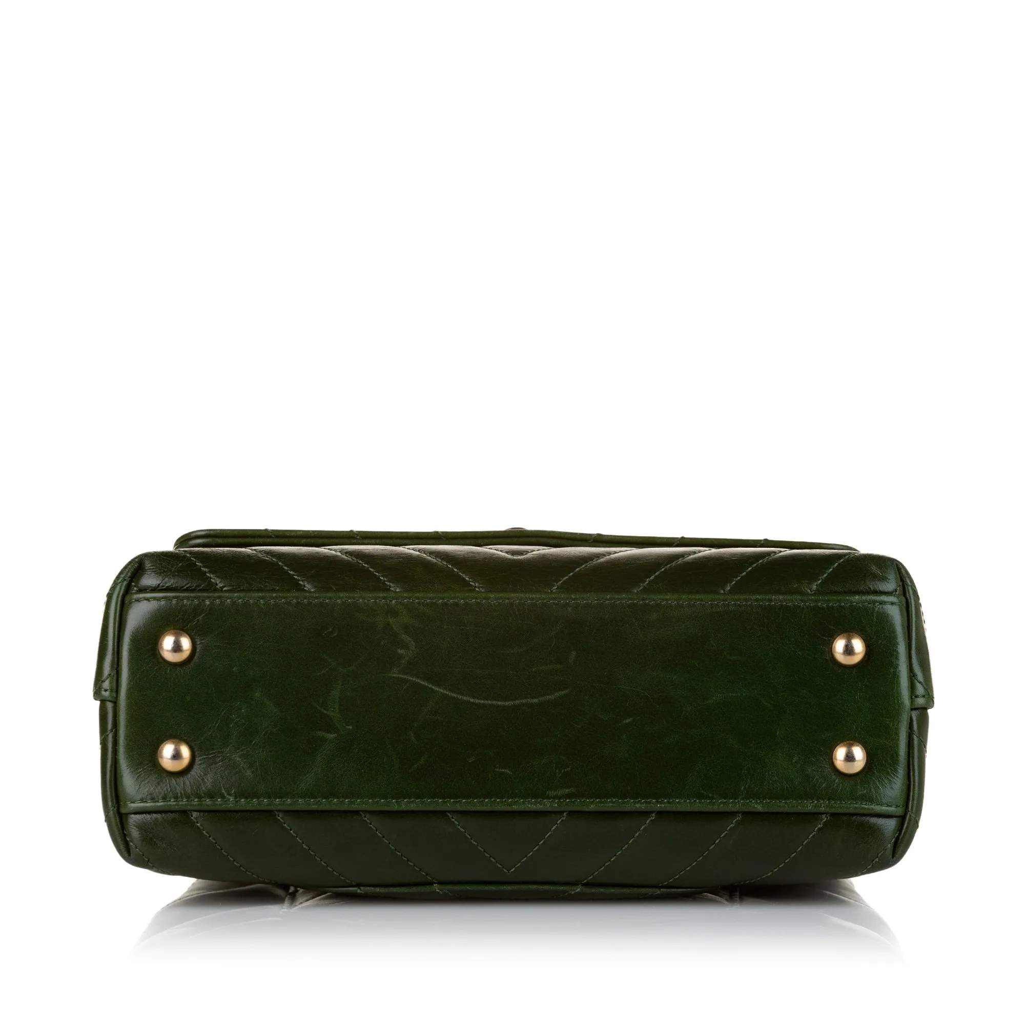 This flap bag features a quilted lambskin leather body, a leather woven chain strap, a flat leather top handle, a front flap with a CC turnlock closure, and interior zip pocket.