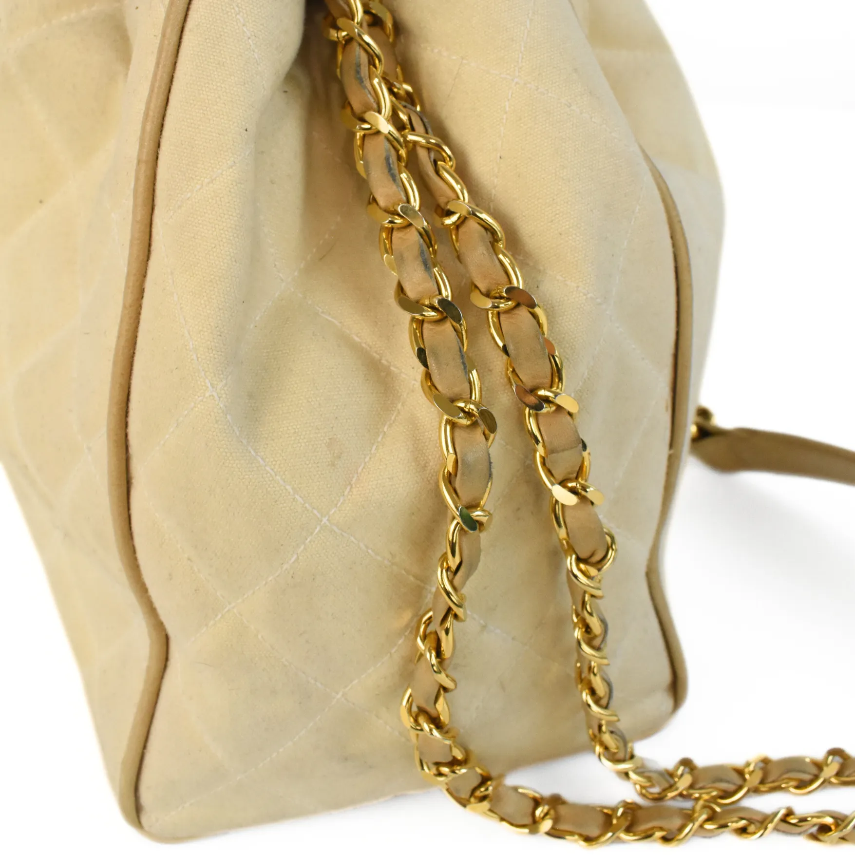 Chanel bucket bag in cream quilted canvas with beige leather accents and signature chain strap that doubles as the drawstring closure. Features a leather shoulder rest with embroidered CC logo. The interior is lined with beige vinyl and features two flat zip pockets.
