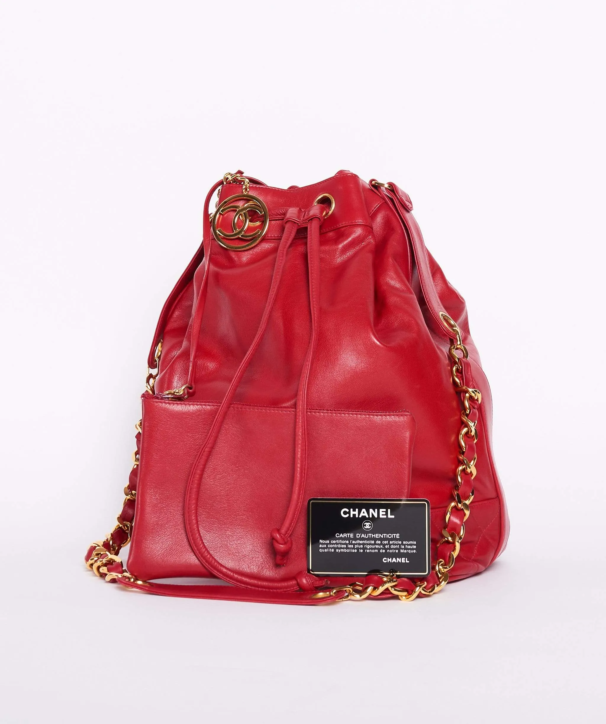 We are avid fans of the vintage Chanel bucket bags and this Chanel CC Drawstring Chain Bucket Bag is top of our list. This Chanel bucket bag is crafted from red supple lambskin leather and finished with Chanel's iconic gilded 24 carat gold hardware. This Chanel bucket bag features a drawstring style and the iconic Chanel CC logo at the base of the bag.