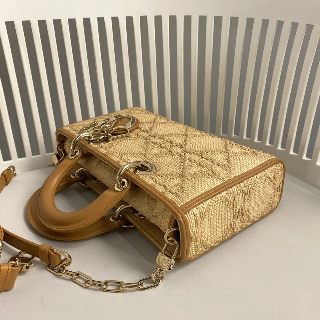 The Lady D-Joy bag captures the House's vision of elegance and beauty by showcasing the iconic streamlined aesthetic of the Lady Dior line. Crafted in raffia with Cannage stitching, the refined and timeless style is enhanced by pale gold-finish metal 'D.I.O.R.' charms offering an elegant allure. Featuring one removable chain shoulder strap and another adjustable and removable leather shoulder strap, the Lady D-Joy bag can be carried by hand, over the shoulder or crossbody as a daily companion.