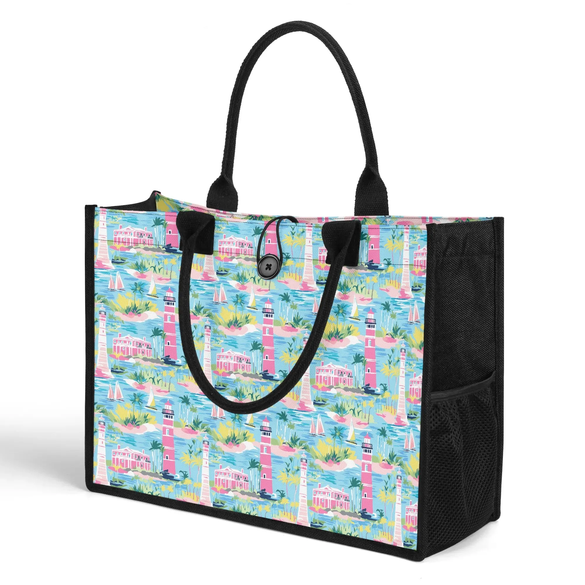 Coastal Charms: Sailboats and Lighthouses Adorning the Coastline Structured Button Closure Canvas Tote Bag in 2 Sizes