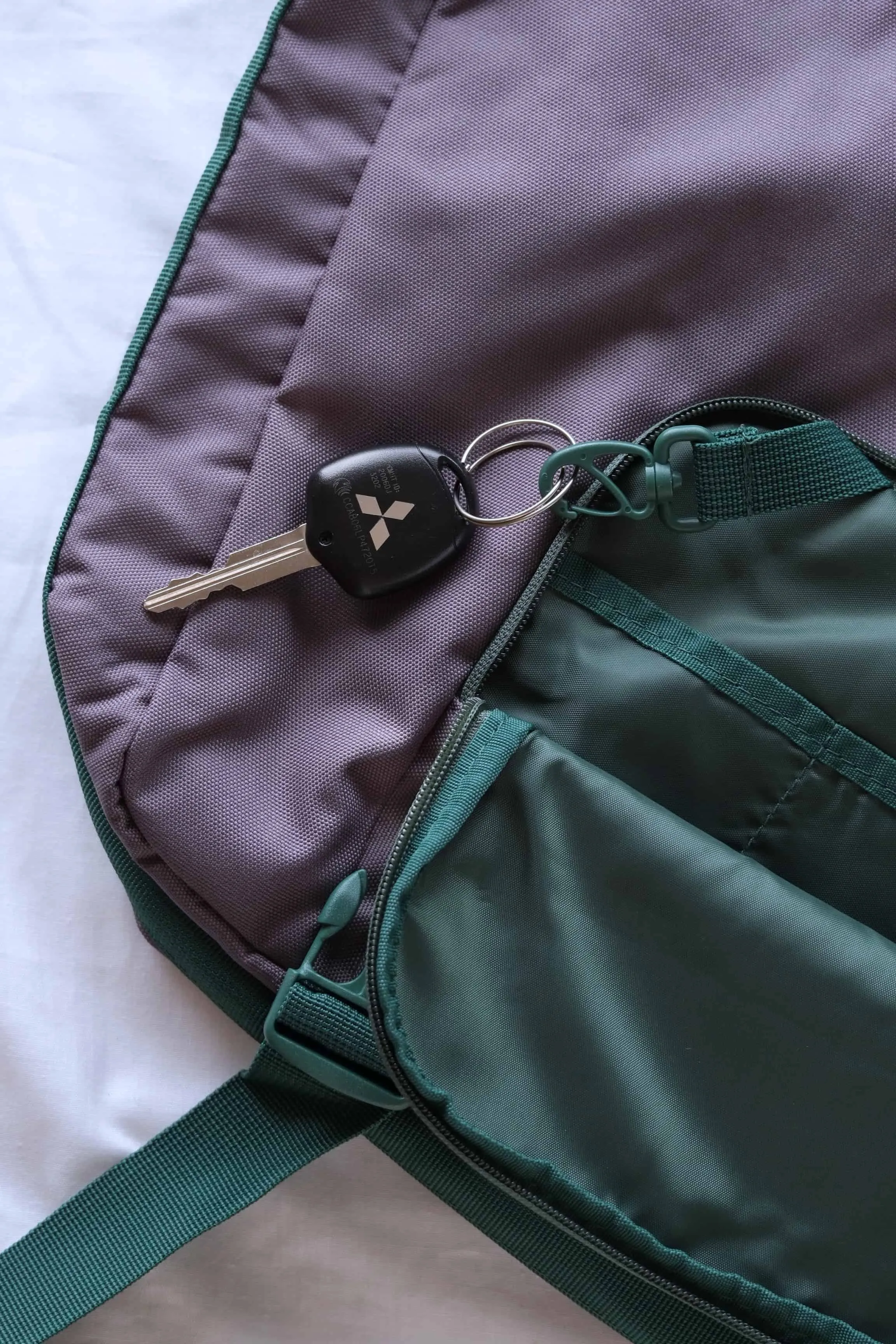 Vintage shoulder bag from the 2000s, with a main compartment, a laptop compartment with Velcro closure, a hidden zip pocket on the flap, and a smaller compartment with pen holders and a key tether under the flap. The shoulder strap is adjustable, the bag can also be carried with the carrying handle on top.