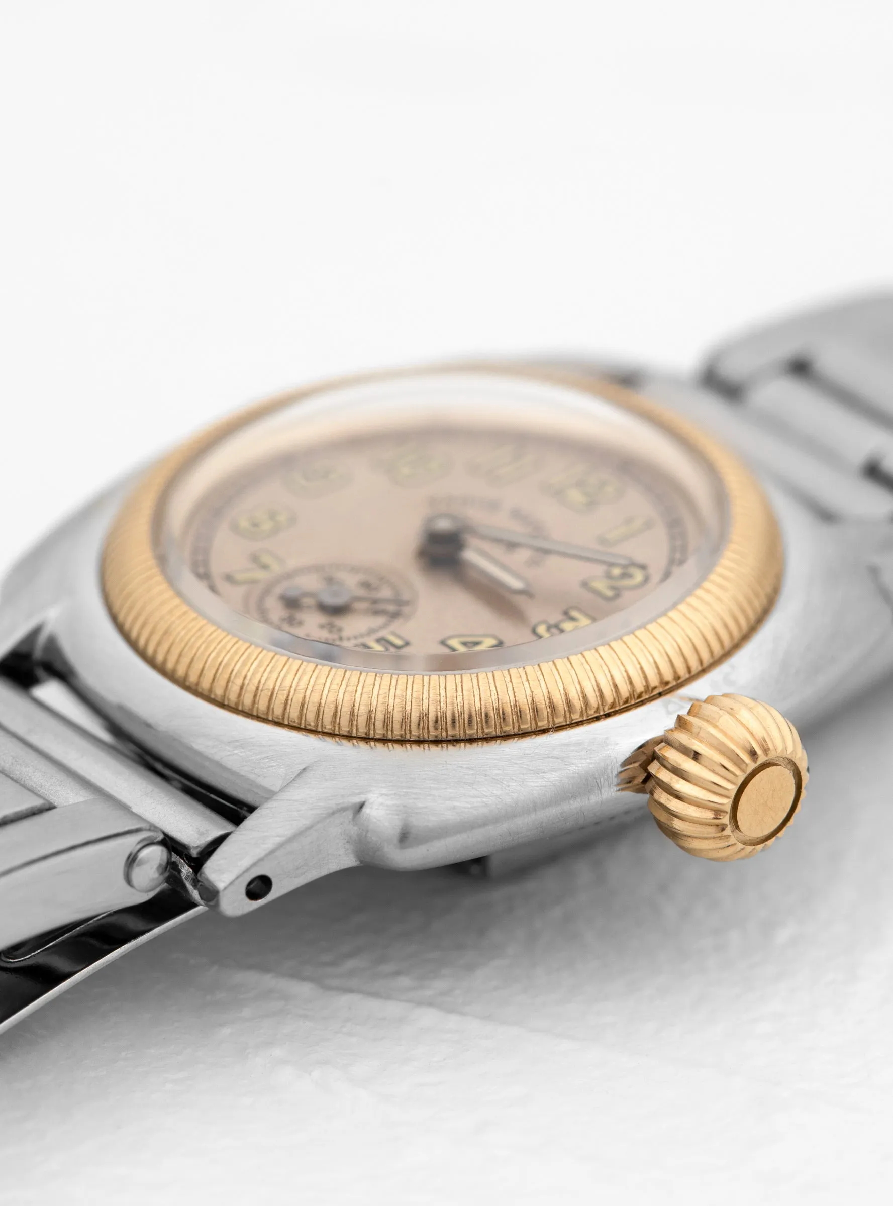 Made from silver-tone stainless steel with gold-tone accents, this Coussin Early watch from Vague Watch Co. features Japanese quartz movement and domed hard crystal glass.