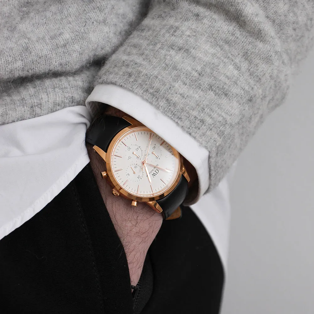 The Daniel Wellington DW00100646 Iconic Chronograph Sheffield provides everything you need for a productive day. Combining classic chronograph aesthetics with our signature minimalist white dial and a rose gold frame, it seamlessly integrates style. Featuring three sub-dials, it offers multiple stopwatch functions for precise timekeeping.