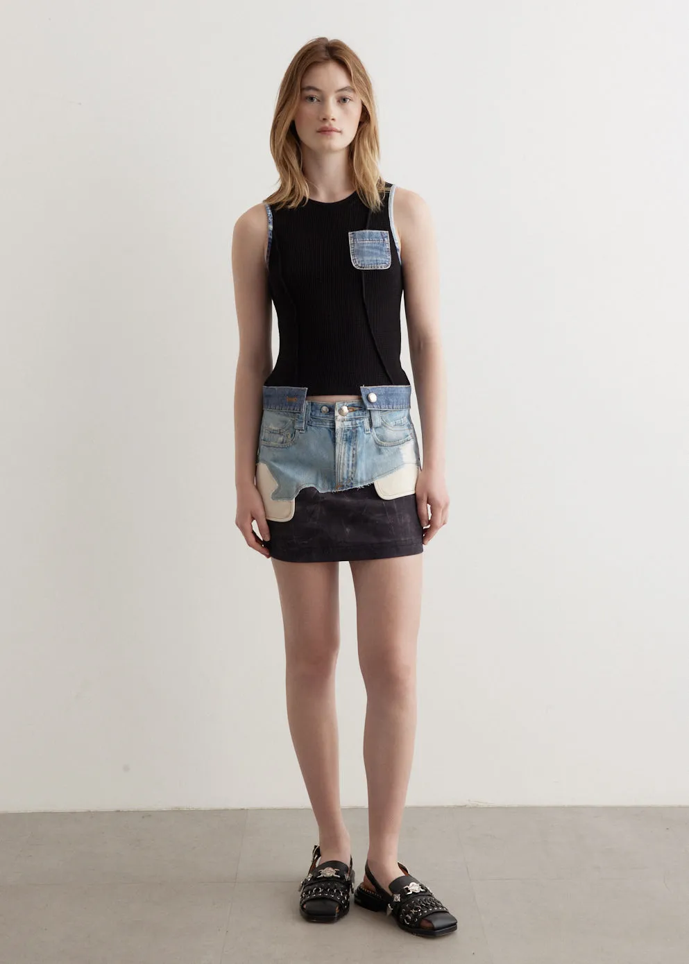 The identity of Andersson Bell was inspired by the merge of two contrasting cultures, reinterpreting Scandinavian aesthetic to create garments from a Korean perspective. Crafted from a faux cotton denim, the Faux-Denim Leather Printed Mini Skirt has an all-over printed denim pattern.