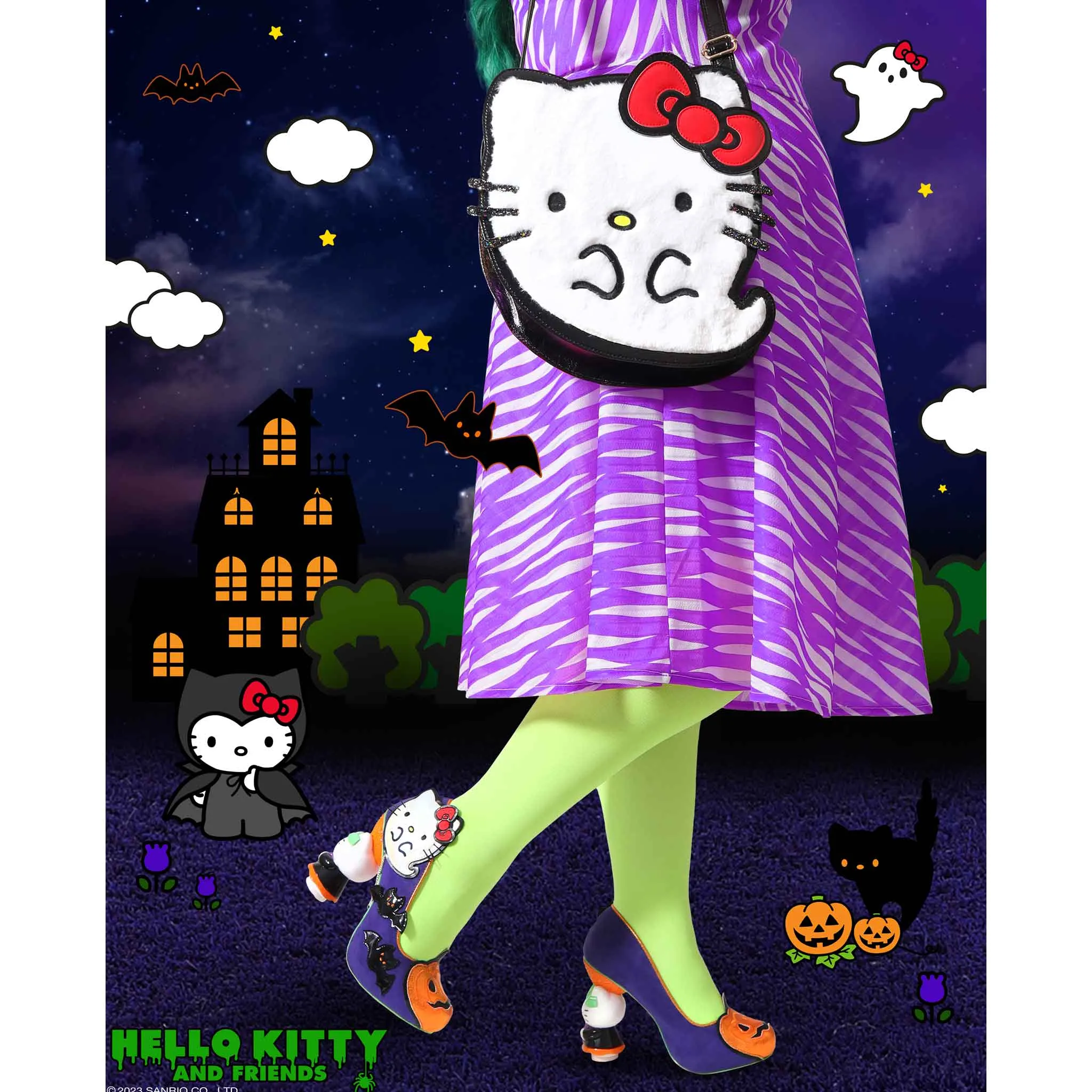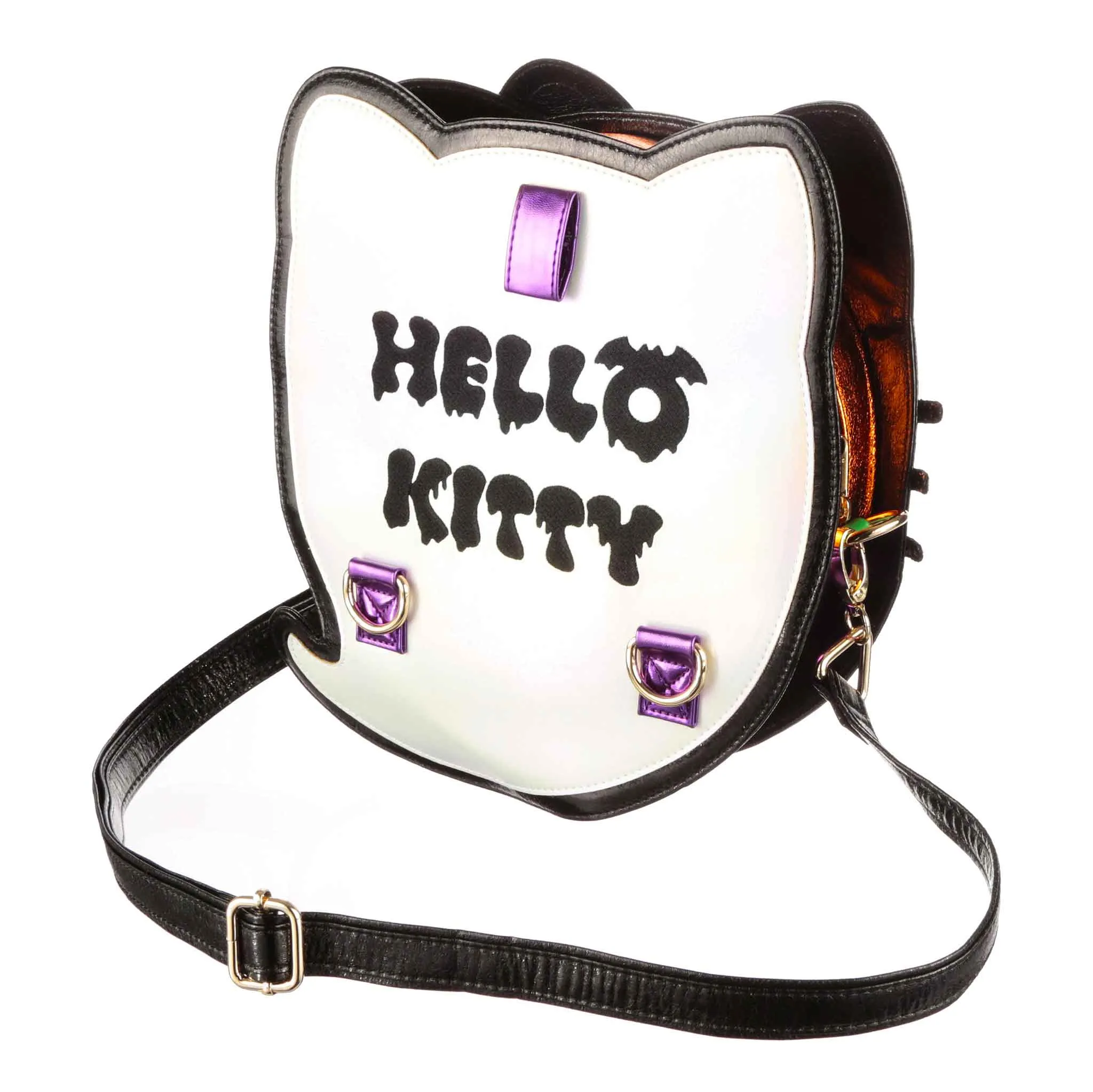 BOO! This bootiful Hello Kitty ghost multiway handbag is here to solve your daydream to nightmare accessory needs! With a faux fur fluffy front and glittery whiskers, and an iridescent reverse with Hello Kitty horror-rific embroidered text, this shoulder bag can transform into a cute backpack! Secured with a top zip, inside pockets, and lined with soft orange velveteen, this is the perfect spooky season party bag.