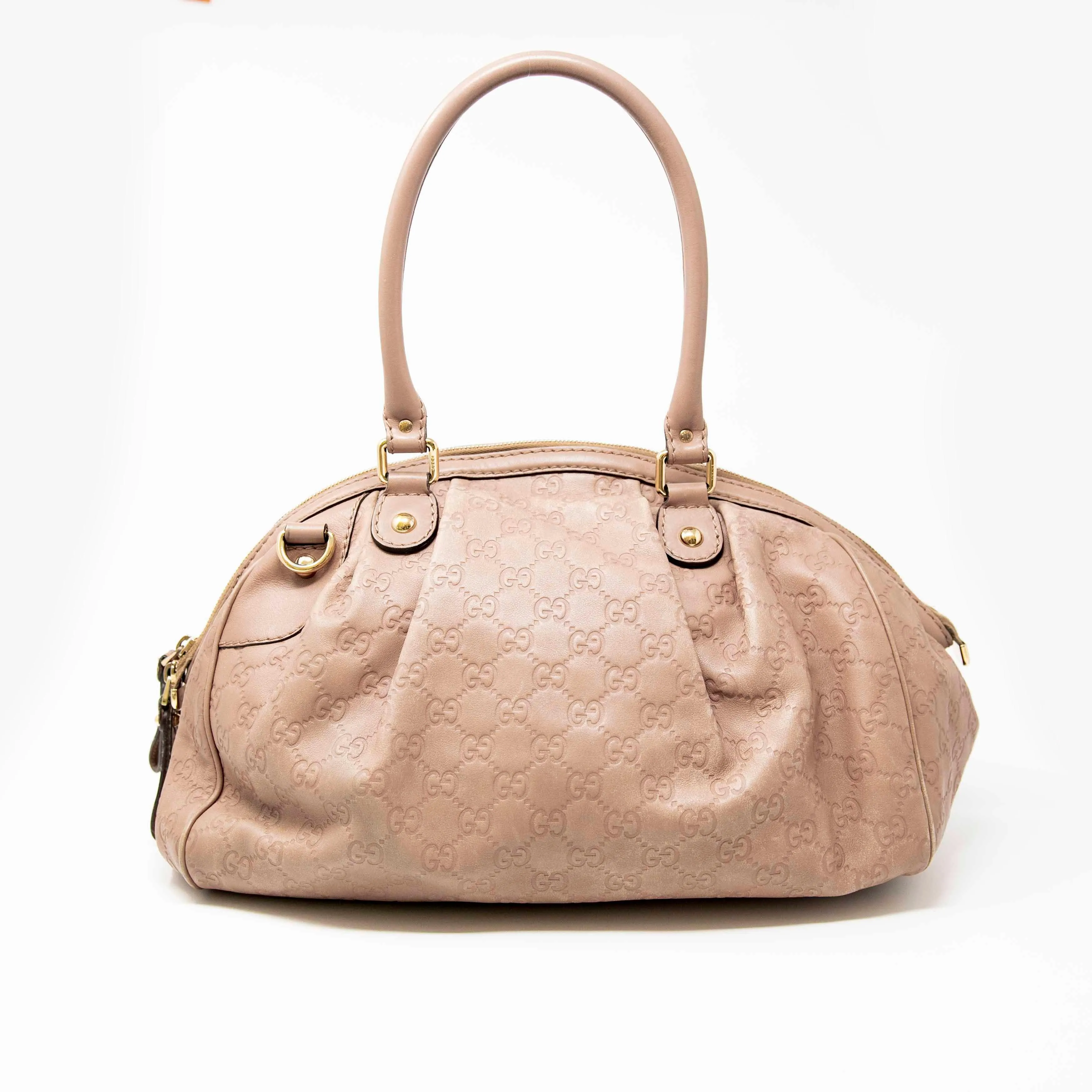 This Gucci Medium Sukey Boston Bag is beautifully crafted from pink beige leather, featuring the iconic interlocking G logo. The bag includes gold-tone hardware and offers practicality with its sturdy rolled handles and a detachable single shoulder strap. It closes securely with a zip at the top and opens to a fabric-lined interior that includes a single pocket, making it both functional and stylish for daily use.