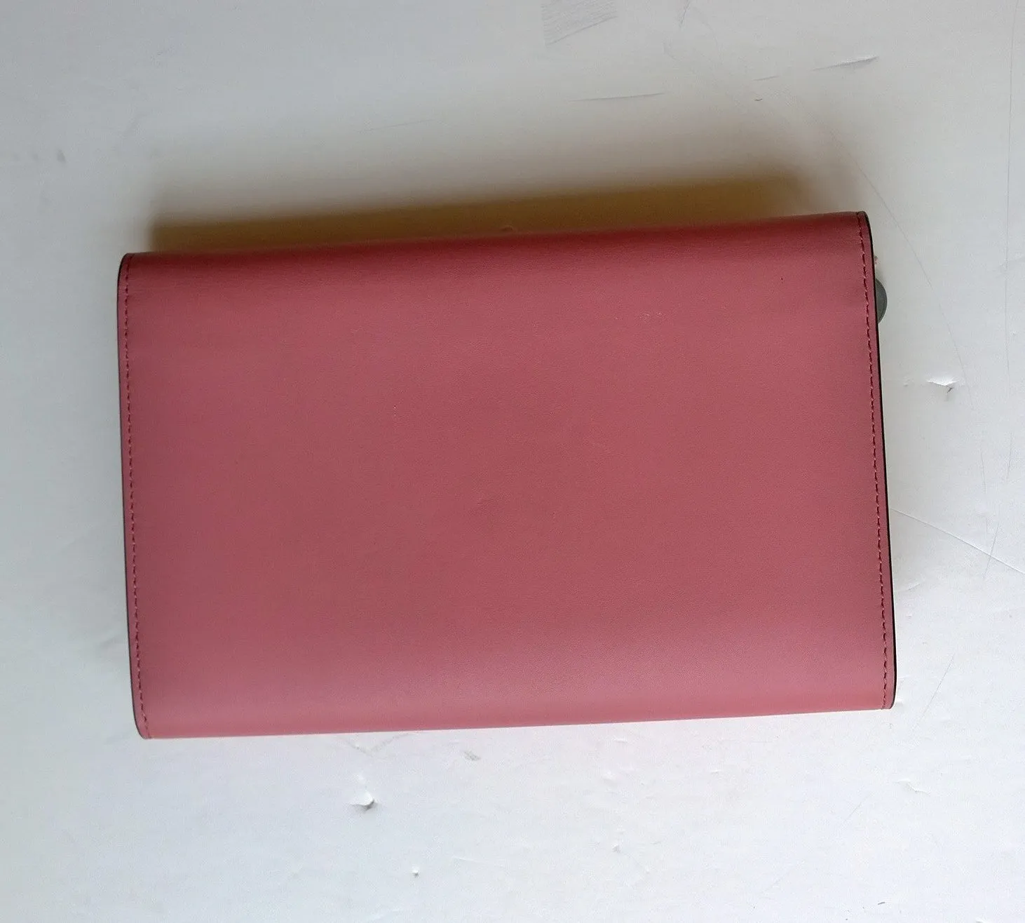 A beautiful peony pink leather clutch with imitation pearls and GG logo decorated in center with gold tone stones. Snap button closure. The clutch comes in Gucci box with dust bag.
