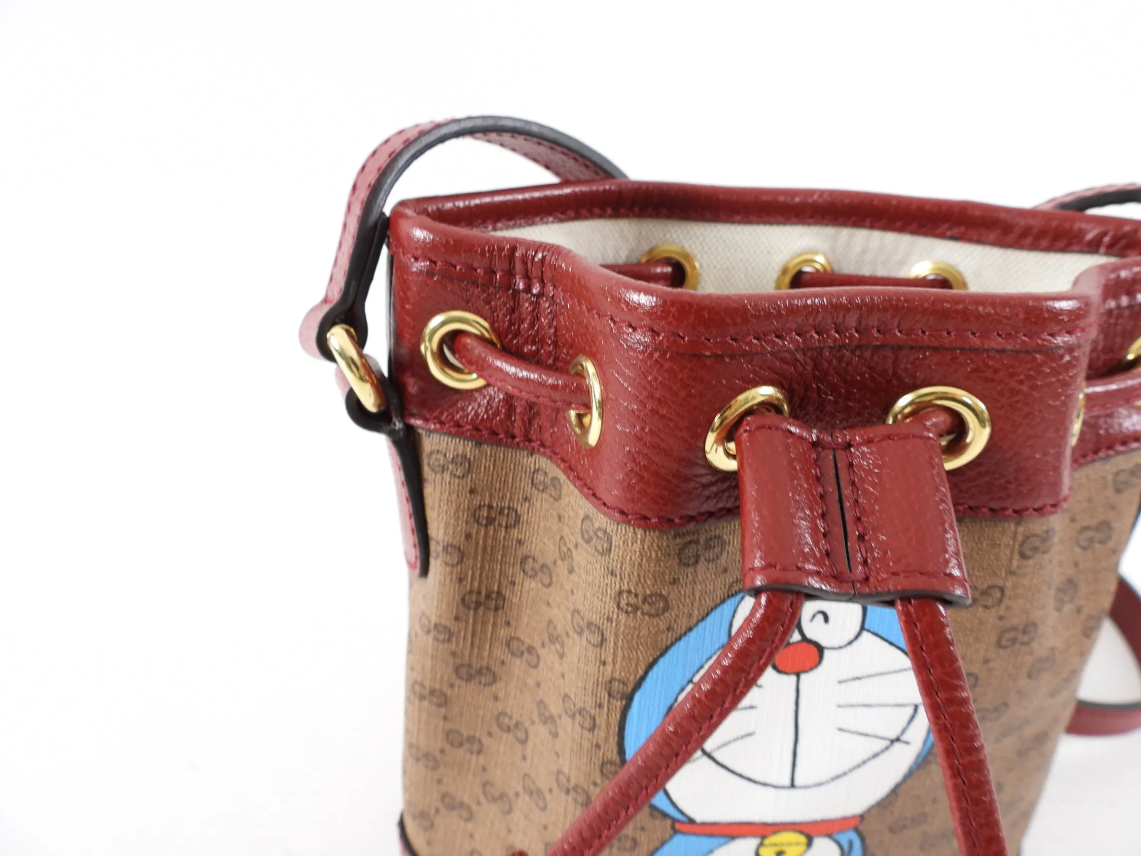 Gucci x Doremon Burgundy Monogram Mini Bucket Bag.