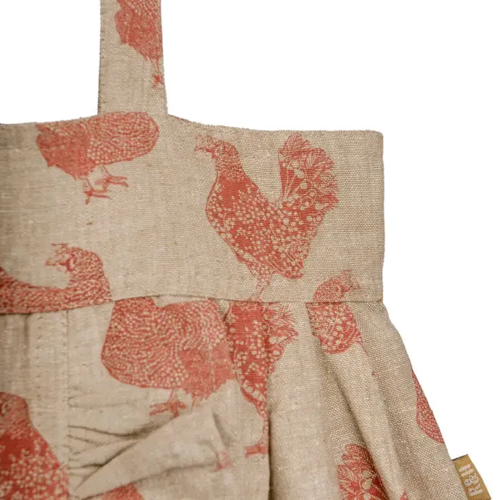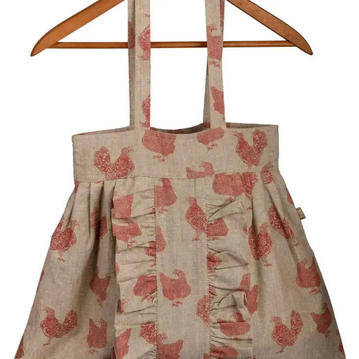 Add some urban country chic to shopping with this Fig color Chicken pattern tote. The ruffled front add some sophisticated fun to this tote 17 x 21.5. Made of100% sustainable, recycled cotton and other fibers. Fall Decor.