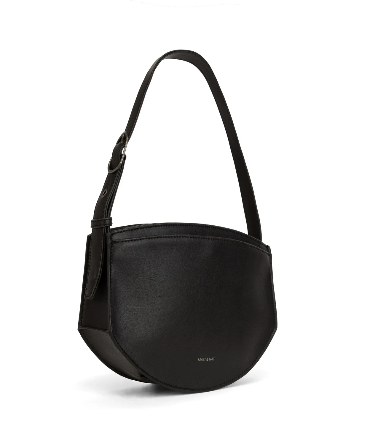 Crescent-shaped shoulder bag with an adjustable strap, top zipper closure at the main compartment, and a front pocket with a magnetic snap closure.