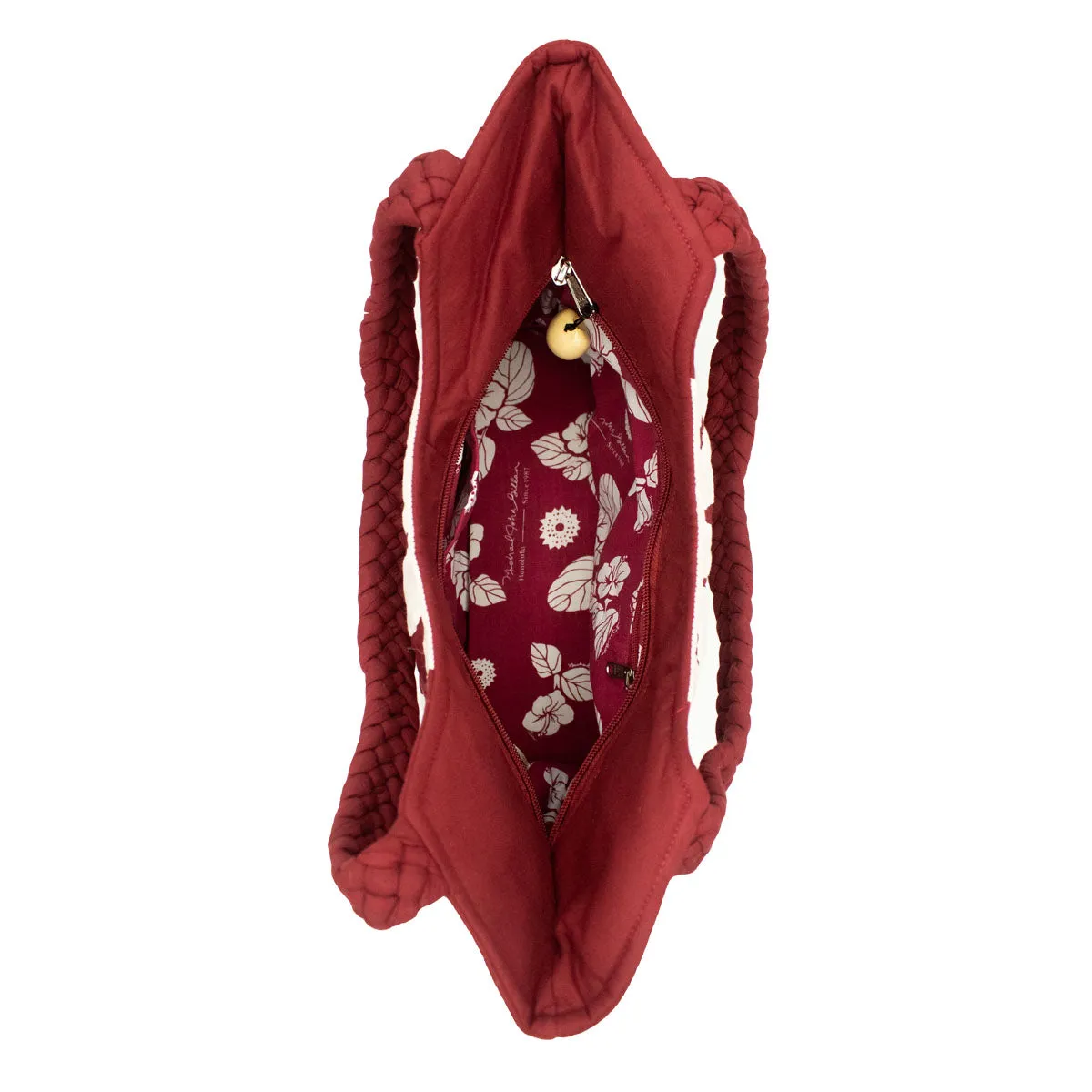 The Kailua Bag features a hand-braided handle, U shaped opening with zipper for added security, one open interior pocket, and a zippered interior pocket.
