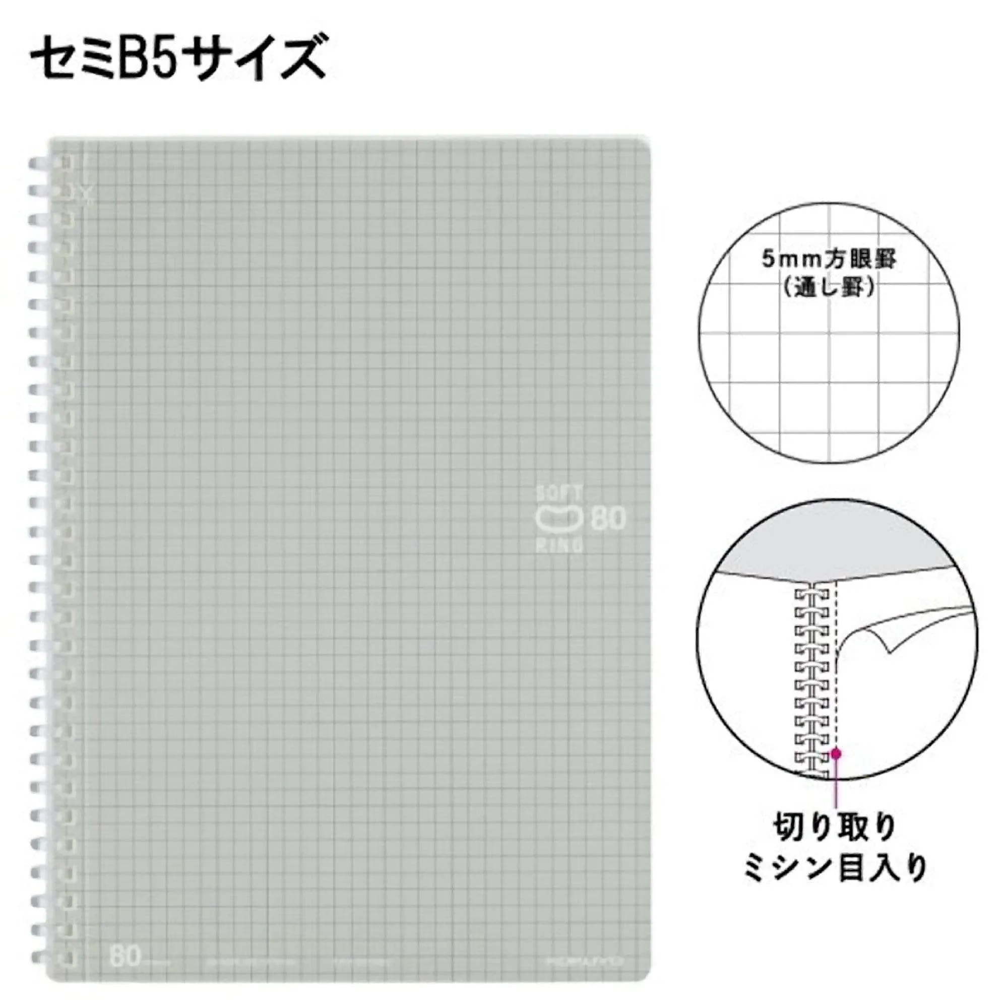 Kokuyo Soft Ring notebooks are spiral/ring bound type notebooks with soft plastic rings instead of metal wires. The rings are smooth, solid, squishy plastic that squeezes to fit along with other books. They spring right back into shape and are soft against your arm or hand.