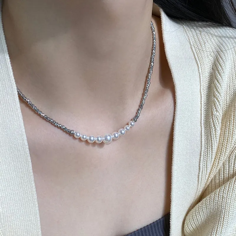 Pearl Necklace- Korean Elegant Pearl Pendant Necklace For Women Girls Silver Color Irregular Metal Chain Collarbone Wedding Party