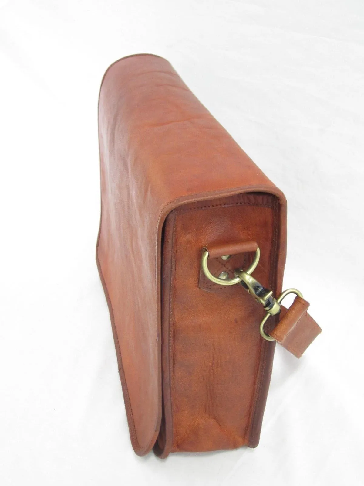 Large Leather Messenger Bag from Vintage collection. Made of high quality distressed vintage goat leather. With a good capacity can easily fit A4 sized files, folders and up to 16" laptop in the large main compartment. Full flap over design with two magnetic studs closure and long, fully adjustable shoulder strap with sliding rubber grip for comfort. Multiple zip & open pockets. Genuine goat leather which is chemical free and comes with a tan oil brown finish. Also the leather bag comes with the genuine leather smell which becomes unique to the user the more it is used. Features