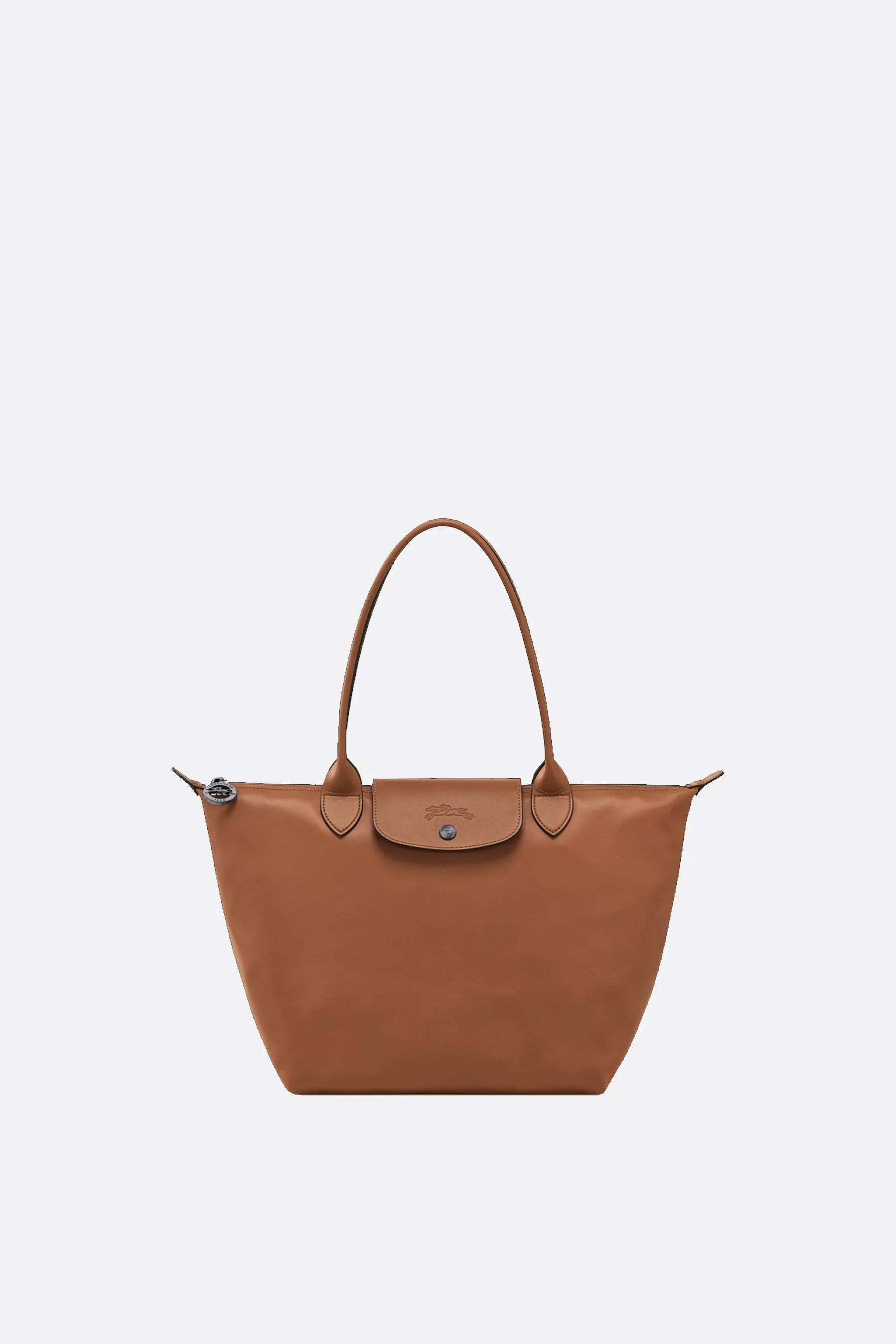 The LONGCHAMP Le Pliage Xtra Tote Bag showcases luxurious cognac cowhide leather and ruthenium-tone hardware. With dimensions of 28x26.5x15.5 cm, this spacious tote offers a blend of practicality and timeless elegance, ideal for daily use.