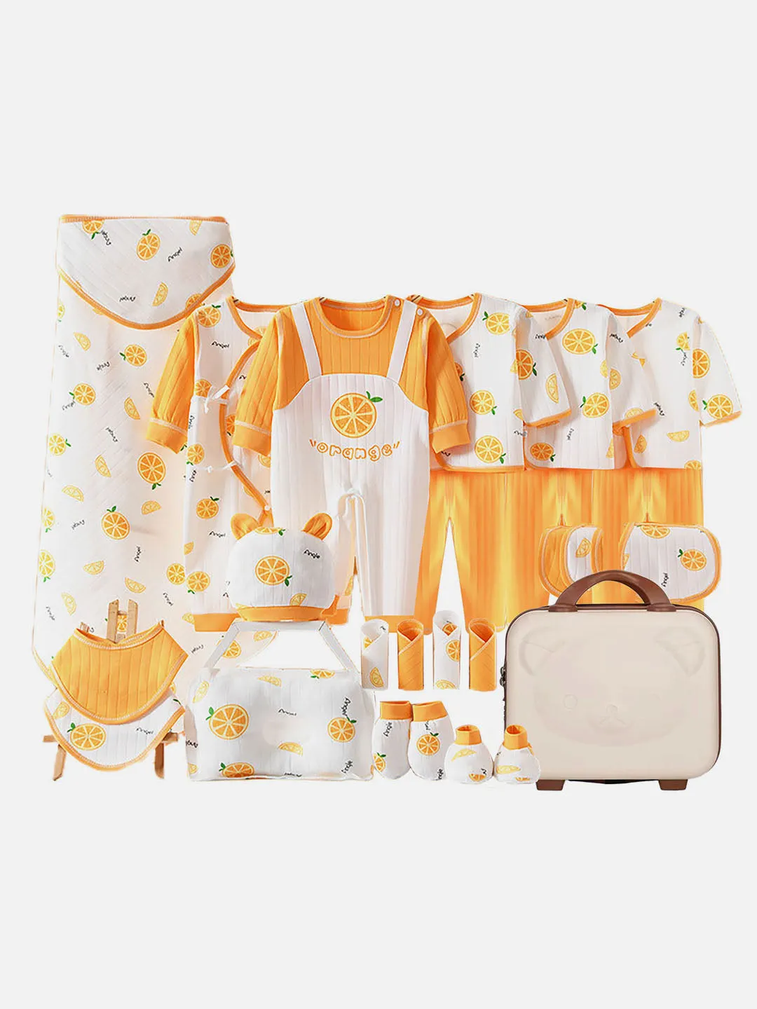 - A Good Mix Of 27Pcs Baby Essentials: This Meticulously Designed Hamper From Little Surprise Box Is A Stunning Hamper To Be Gifted To A Newborn Or To A Baby From 0-6 Months. The Hamper Comprises Of 27Pcs Which Includes 3 Button Romper; 2 Lace Rompers; 1 Pillow; 4 Small Bibs; 1 Big Bib;1 Diaper Pant; 2 Pants ; 1 Quilt; 1 Belly band; 2 Gloves; 2 Foot Cover; 1 Cap; 4 Napkins And 1 Matching Travel Suitcase.