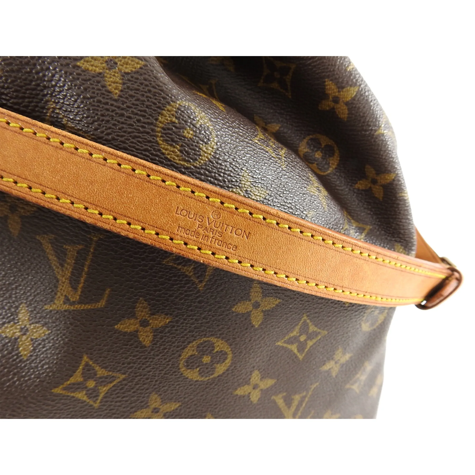 Louis Vuitton Vintage Monogram Grand Noe GM Bucket Bag. Classic square bottom drawstring bucket bag with signature monogram body. Date code 882 for production year 1988. Excellent vintage pre-owned condition with wear and patina to vachetta leather as pictured. Measures about 10.5 x 13.5 x 7.25” with a 13” strap drop.