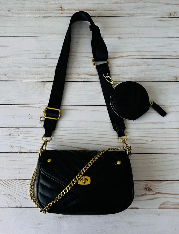 This trendy, quilted crossbody bag, in a range of fashionable colors, offers versatility and style. It features a secure flap closure with a metallic clasp and has a well-organized interior. A highlight is the inclusion of two straps: an adjustable crossbody strap for comfortable, casual wear and an elegant chain strap for a more sophisticated look. Additionally, a matching quilted coin bag adds to its practical appeal. This bag is a perfect blend of function, style, and versatility.