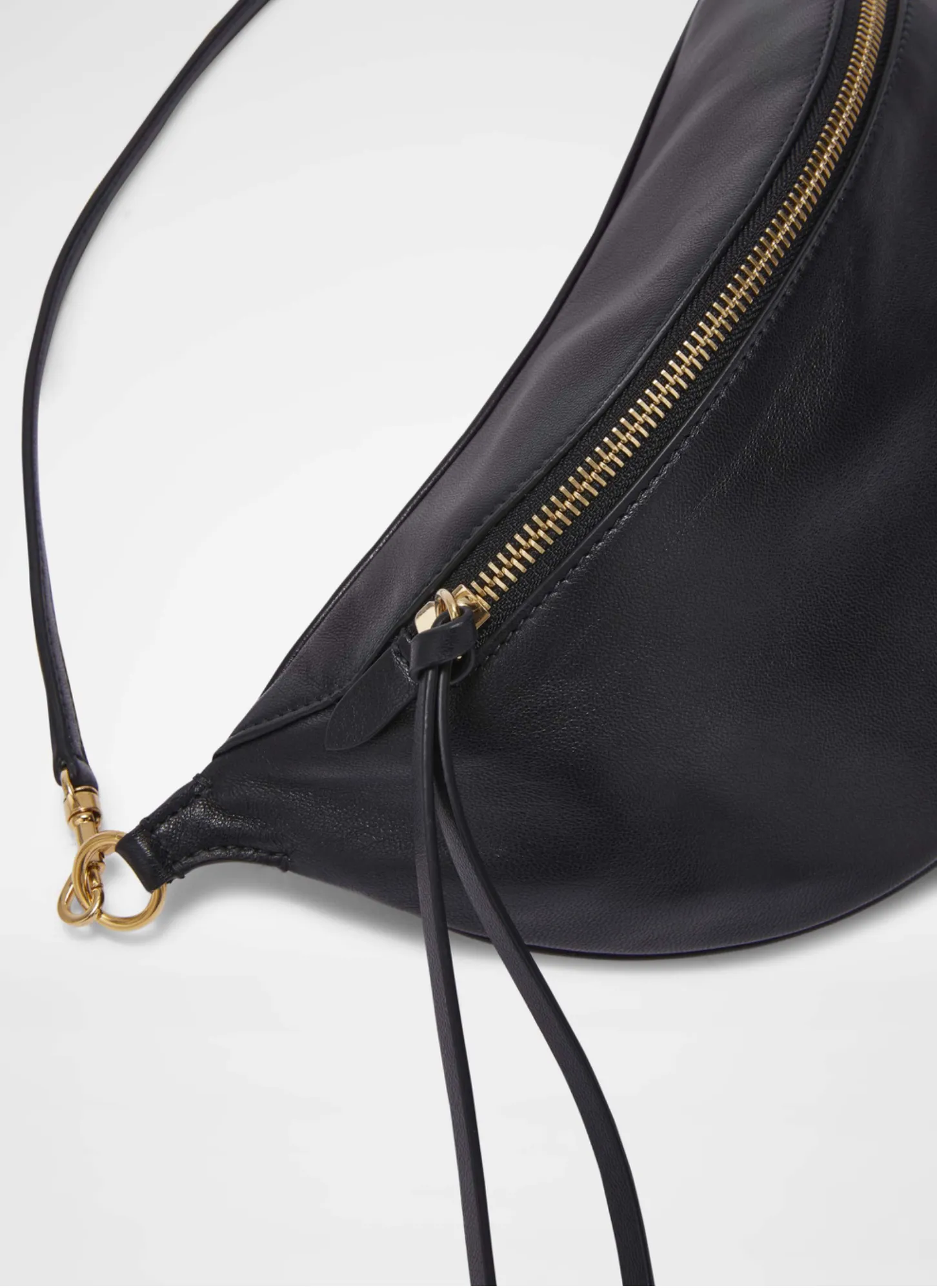 Handle and shoulder bag in soft black leather is shaped to a crescent silhouette with zip closure. Detachable handle and detachable and adjustable shoulder strap. Jil Sander embossed logo.