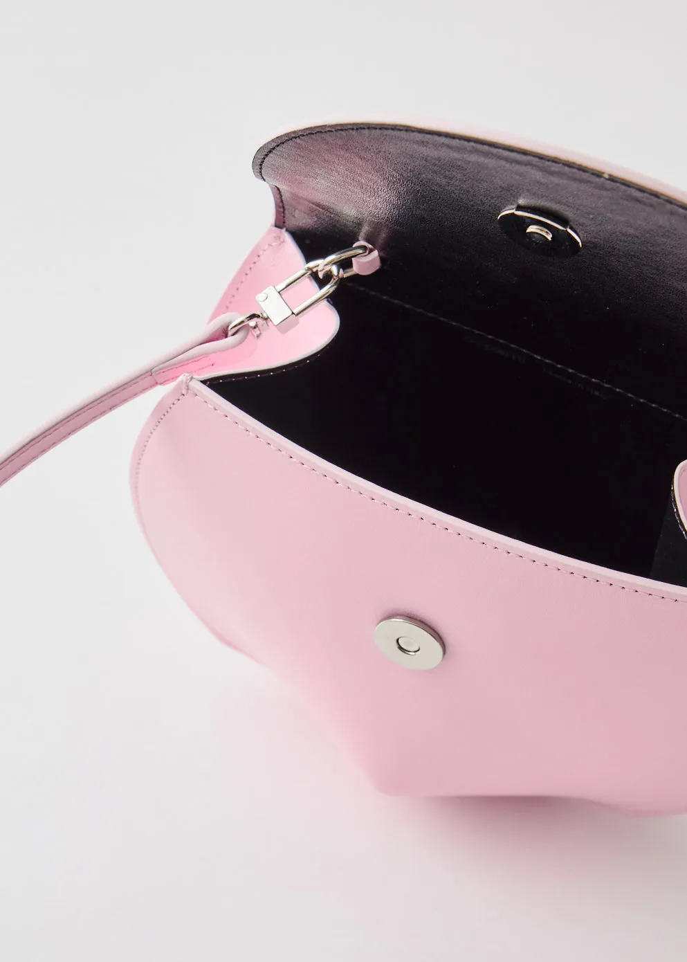 Coperni was established in Paris in 2013 by Sébastien Meyer and Arnaud Vaillant. The brand's sleek version of minimalism is heavily influenced by the digital age, with a particular focus on asymmetry and structure. The crescent shaped Mini U.F.O Bag is made from glossy pink leather, with an arching handle and a detachable cross-body strap.