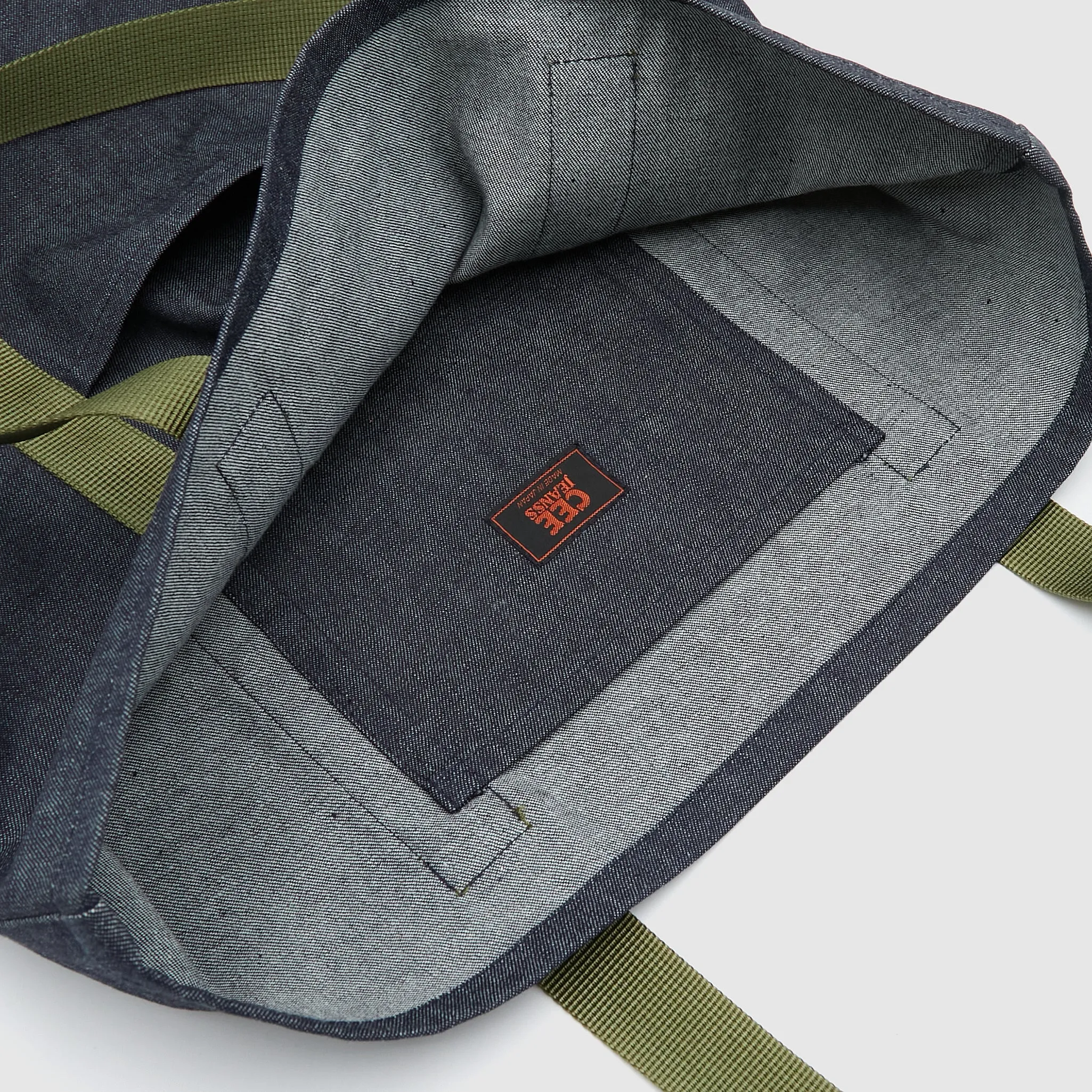 Denim tote bag, made from high quality Japanese denim. With contrasting colored straps. One outside pocket and one internal pocket.