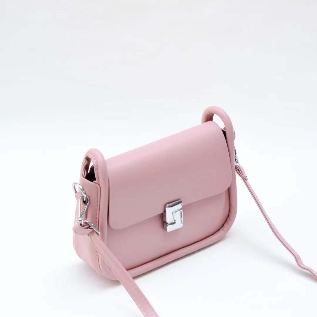 This bag features a pink crossbody handbag with a minimalist design. The bag has a smooth matte finish and a rectangular shape with rounded edges. It includes a flap closure, secured with a polished silver metallic clasp in a geometric shape. The clean and simple aesthetic makes this handbag versatile, suitable for everyday use or for pairing with more formal outfits.