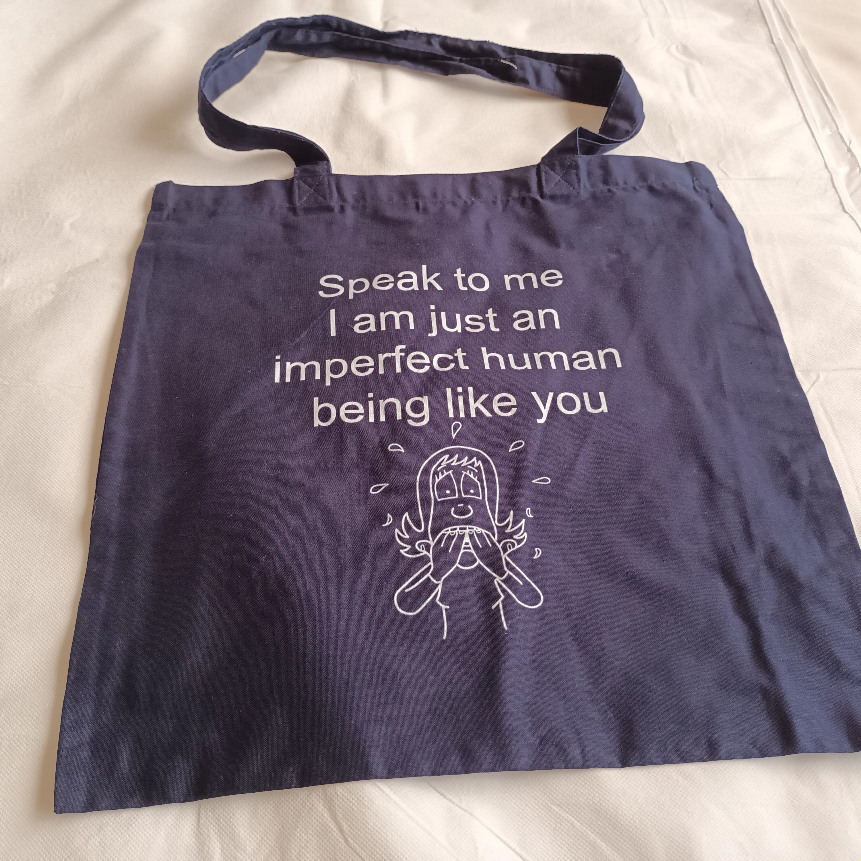 Introducing our navy blue tote bag featuring the meaningful statement "Speak to me, I am just an imperfect person like you" printed in white. This tote is perfect for anyone who wants to express their empathy and willingness to listen to others, and also to remind themselves that they are not alone in their imperfections. Made with high-quality materials, this tote features sturdy handles and a spacious interior to hold all your daily essentials. Stand out with this unique and inspirational tote bag, perfect for carrying to work, school, or any other daily activities. Show your support and love for humanity and kindness with this tote bag.