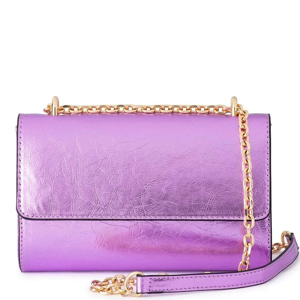 Elegant and understated, the LILIANA Metallic Embossed Shoulder Bag is a timeless piece that will go with just about any evening look. This bag features a metallic textured vegan leather outer and a convertible shoulder chain that can be worn at two lengths. It boasts a roomy interior for your event essentials, including your smart phone, cards, keys, cash and lippy and a removable shoulder chain to instantly go hands free on the dance floor.