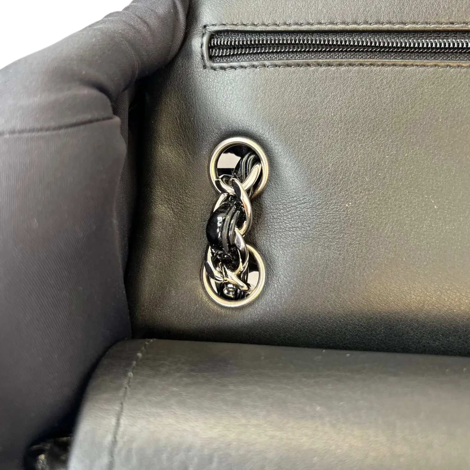 This is an authentic Chanel Patent Quilted Jumbo Double Flap in Black. This classic shoulder bag is crafted of diamond quilted glossy patent leather in black. The bag features silver chain link leather threaded shoulder straps and a facing silver Chanel CC turn lock. This opens the facing flap to reveal an inner flap and a matte black leather interior with patch pockets.