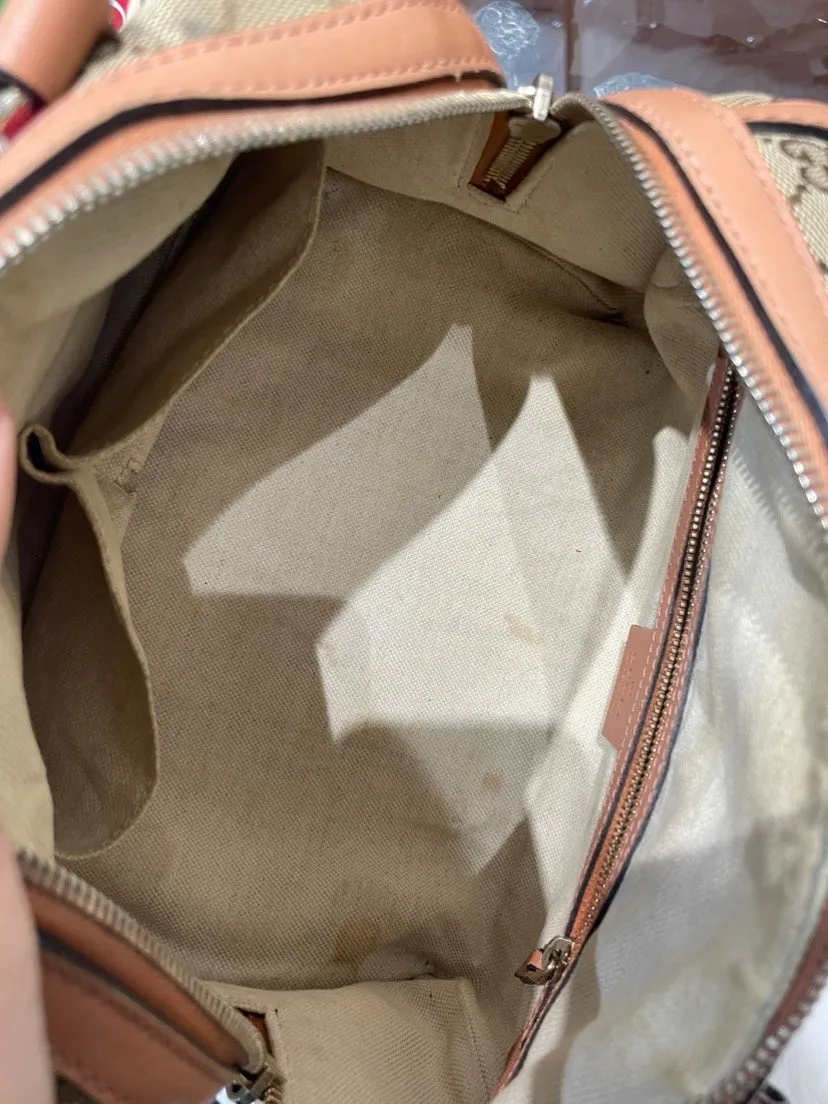This used Gucci Boston Bag is a stylish choice for those who value classic elegance. Crafted from iconic beige canvas with a distinctive striped design, this satchel features comfortable leather handles and a detachable strap. The interior is flawlessly lined with rich brown leather, making this piece a must-have for enthusiasts of vintage Gucci bags and collectors of used designer handbags.