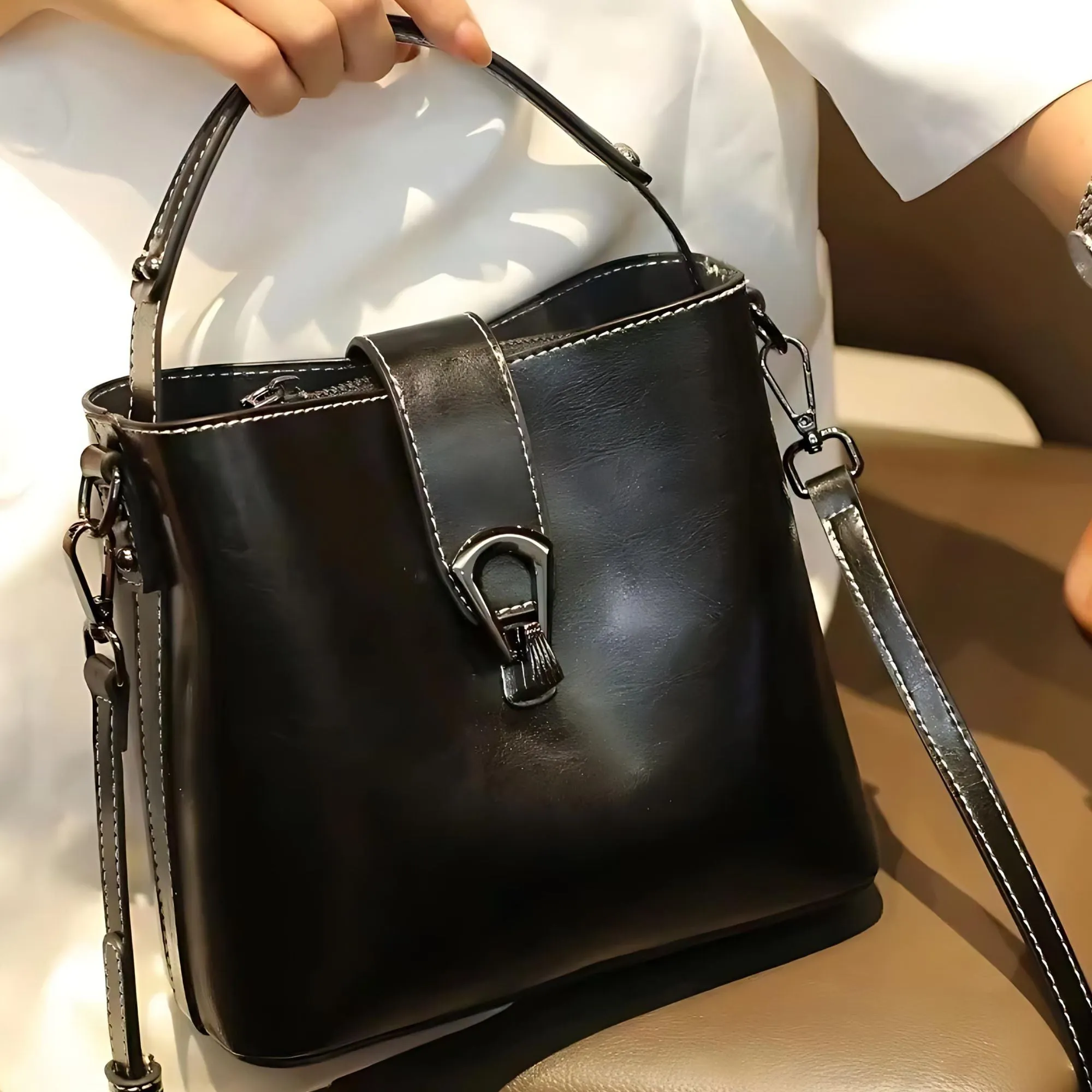 Step out in style with our Real Oil Wax Leather Women's Bucket Bag! This versatile accessory is perfect for both casual outings and formal events, offering a chic blend of functionality and fashion. Made from premium cow leather with a luxurious oil wax finish, this bag is designed to impress and last.