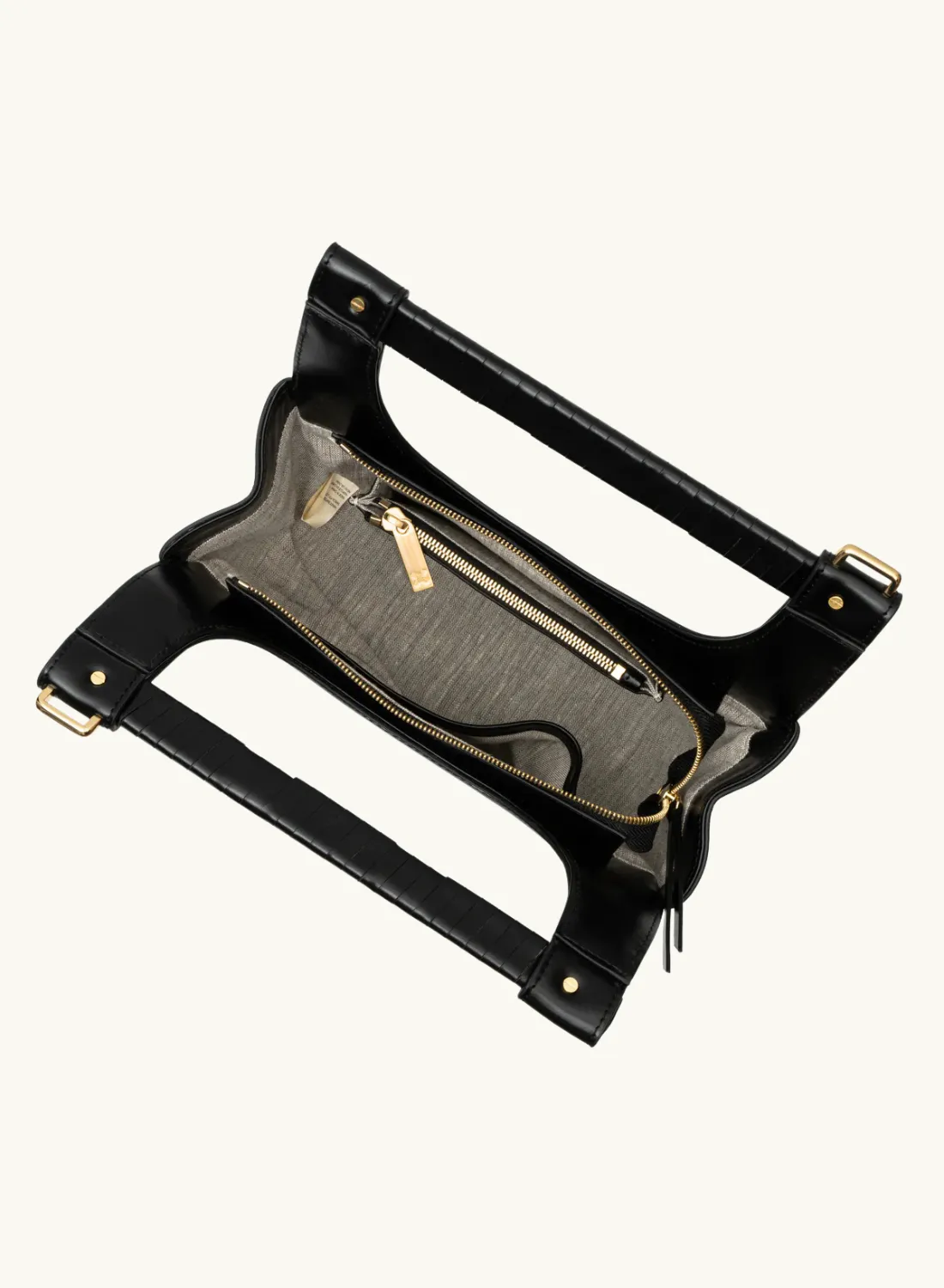 The sister to our Cybil bag, the Almira Bag features SANCIA’s leather wrapped handle with a crescent shaped body. Made in sumptuous full-grain leather, the two sides of the handlebar pull apart to access the inside. The bag has a hard structure and features a wide removable shoulder strap option. With a roomy interior to be a stylish yet practical addition to any outfit.