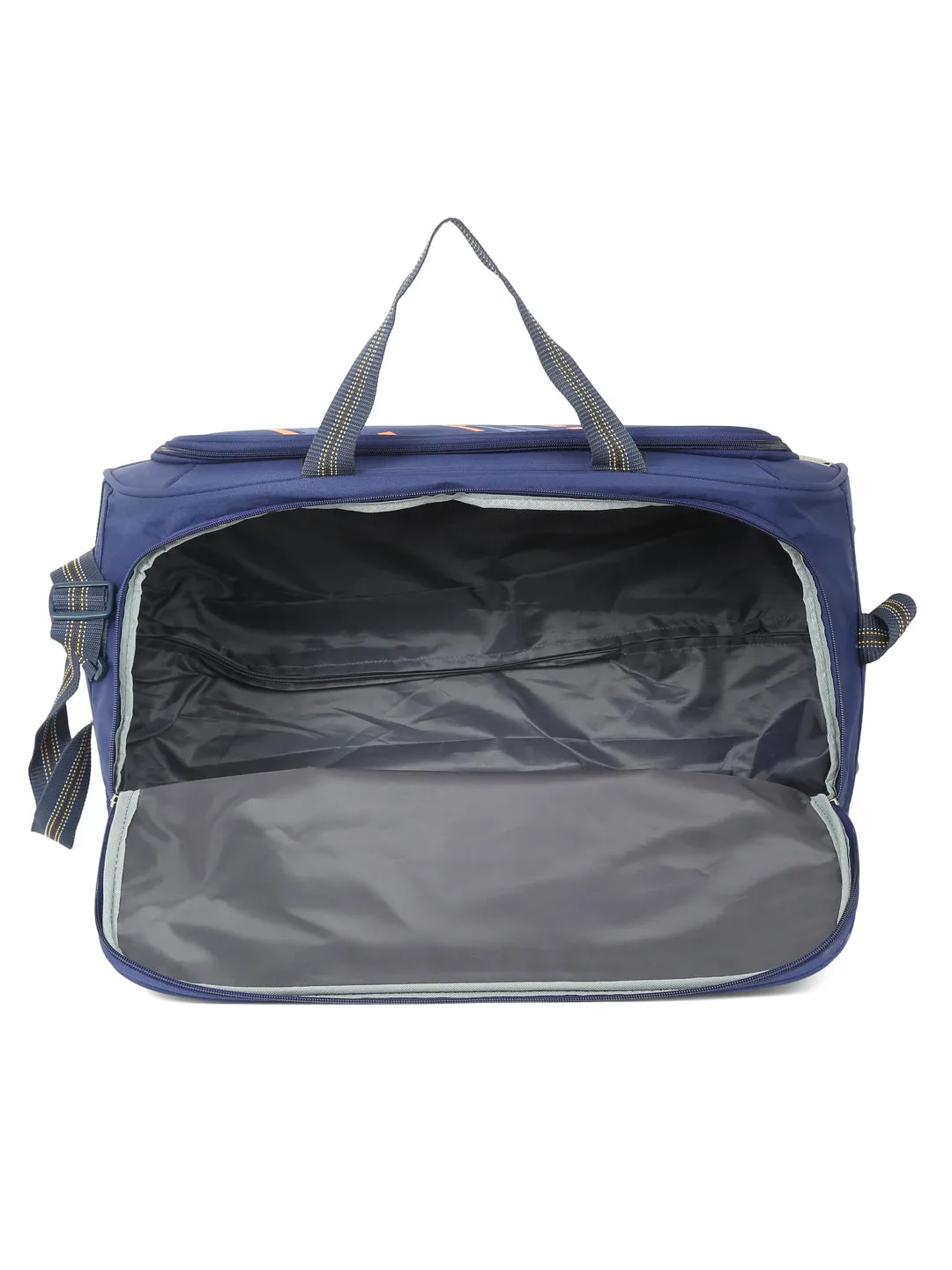 Disclaimer: Navy Blue printed large duffel bag, Two short handles with velcro closure and an adjustable and non-detachable shoulder strap, Smooth rolling wheel, One main spacious lock-friendly zip closure compartment, and One external zipper pocket for small accessories.