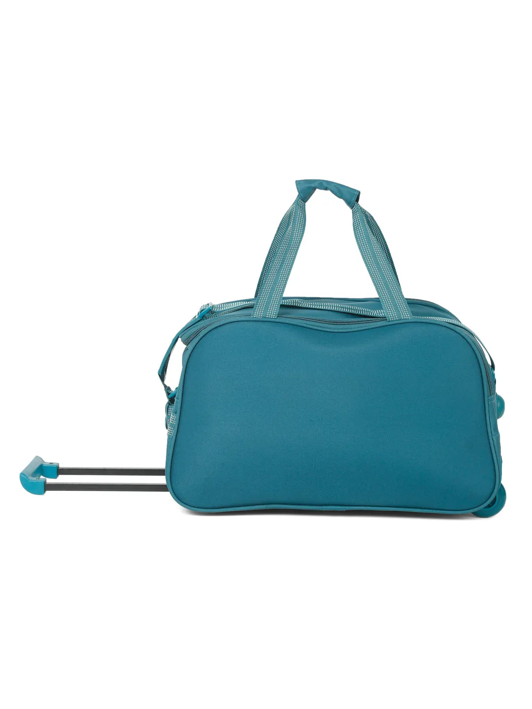 Disclaimer: Teal printed cabin sized duffel trolley bag, secured with zipper closure, Two handles on the top with velcro attachment, one handle on side, has a trolley with retractable handle, 180-degree rotatable skate wheels with corner mounted, One main compartment secured with a zip, One external zipper pocket for small accessories, Detatchable and adjustable shoulder sling strap