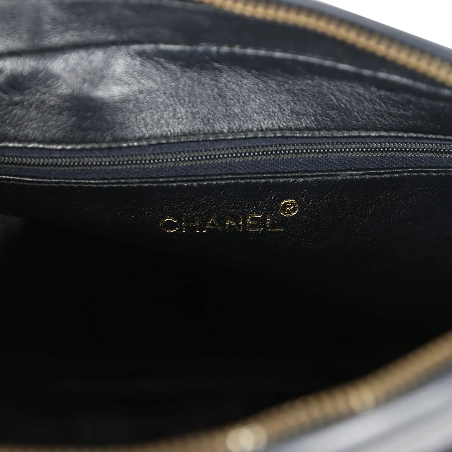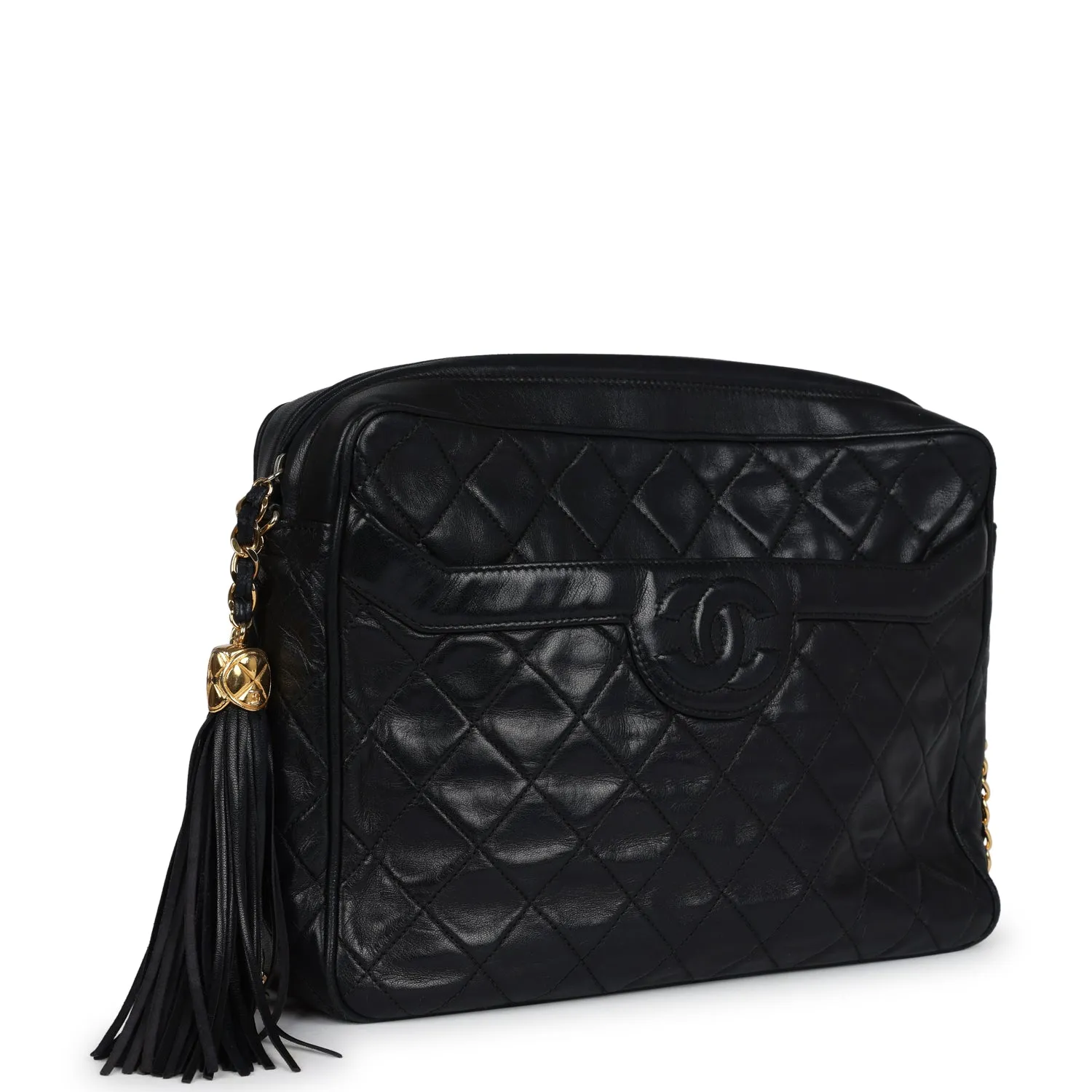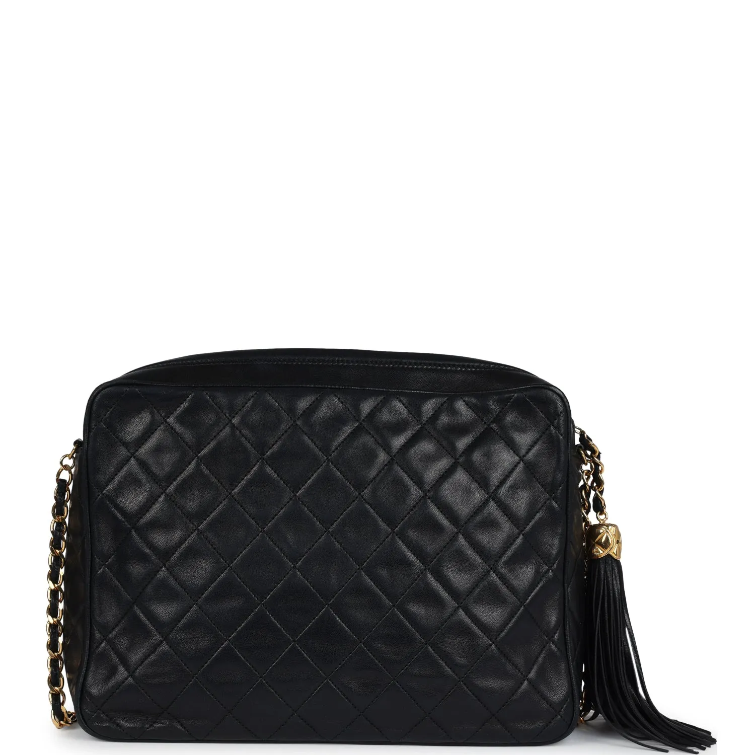This vintage Chanel Large Front Pocket Camera Bag is of black lambskin leather with Gold Hardware, featuring signature diamond quilt, front pocket with quilted CC turnlock closure, top zipper closure with tassel zipper pull, and a single interwoven black leather and gold tone chain link shoulder strap.