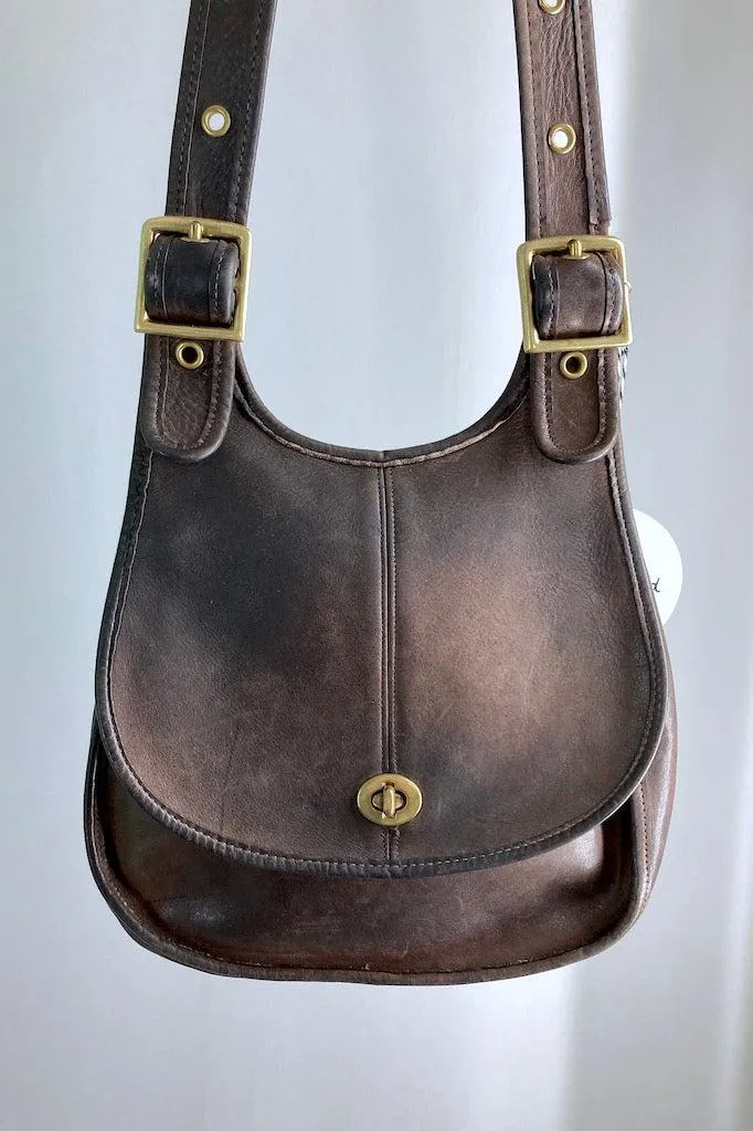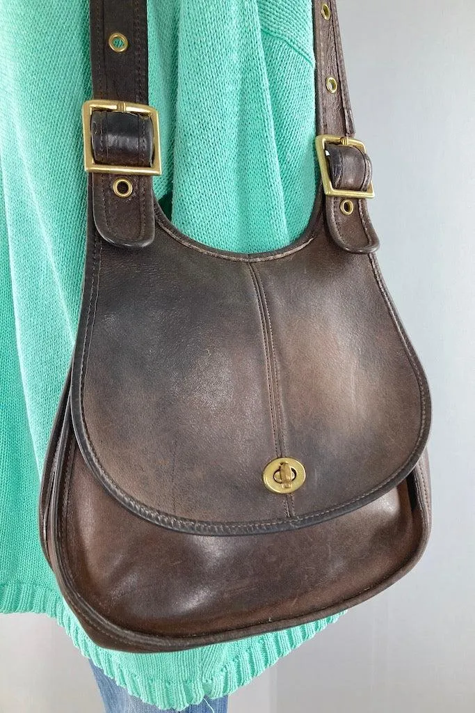 Fabulous and SUPER RARE 1960s to early 1970s Coach Crescent Saddle Bag. This is pre-creed and pre-serial number, it is one of the true original Coach bags. In dark brown full grain leather with a beautiful patina. It features an adjustable strap, heavy brass hardware, front flap with turn-lock clasp, and one main inner compartment with full size side pocket. Inside is embossed simply with the original Coach stamp. It is in very good condition, showing typical wear for the age. It has been cleaned and polished with authentic Coach care products. See all photos.